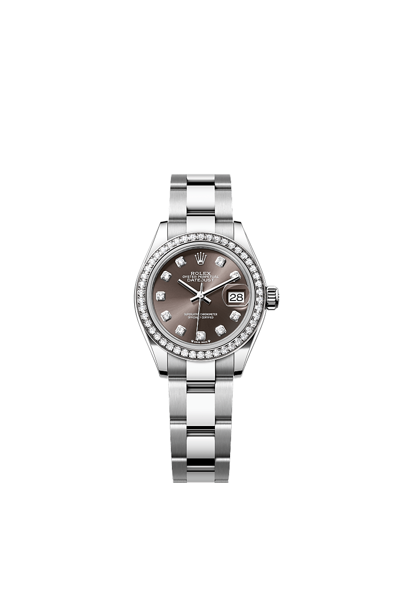 Oyster Perpetual Lady-Datejust ทำจากOystersteel และทองคำขาว โดดเด่นด้วยหน้าปัดสีเทาเข้ม, ประดับเพชร และสาย Oyster