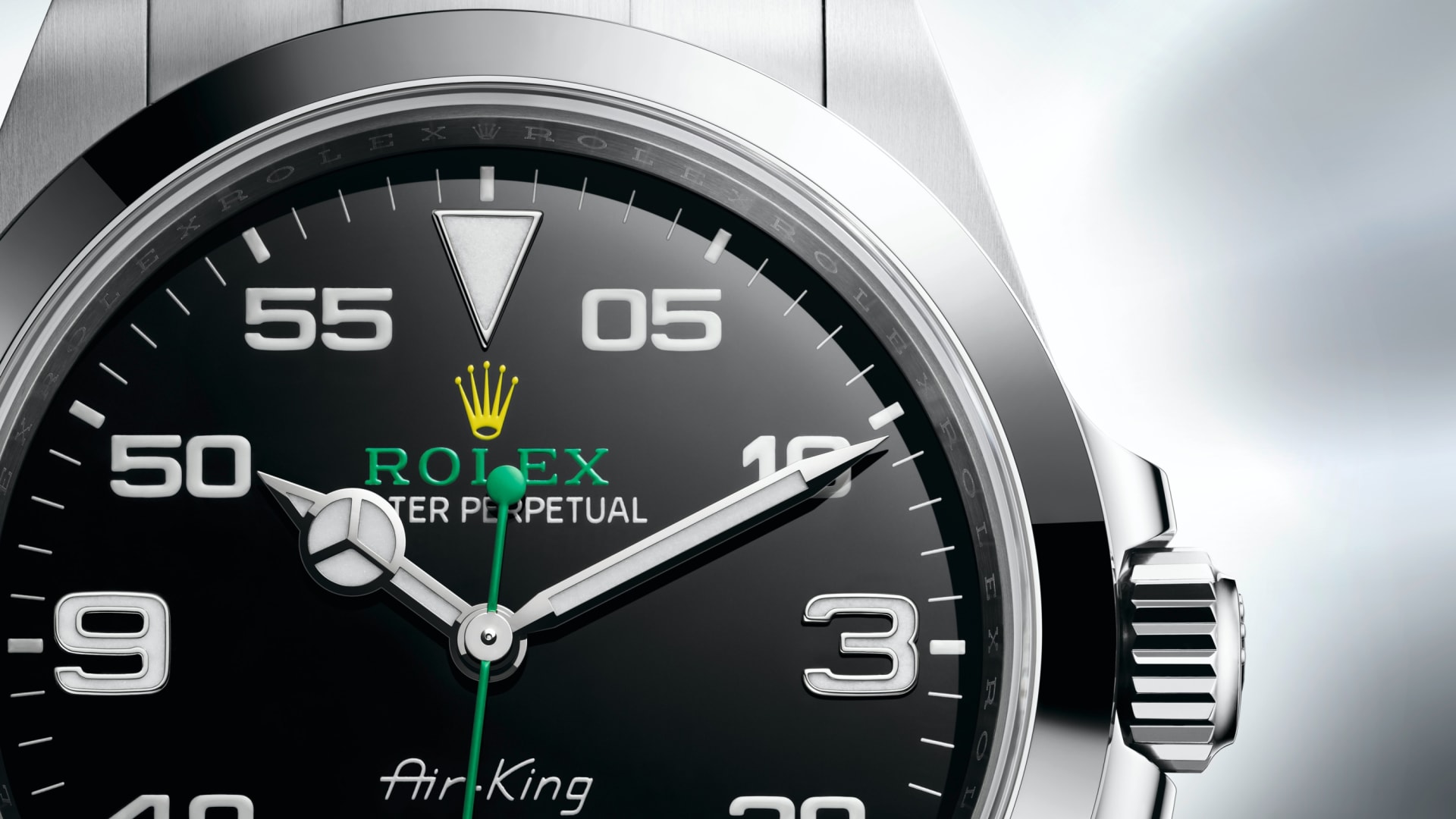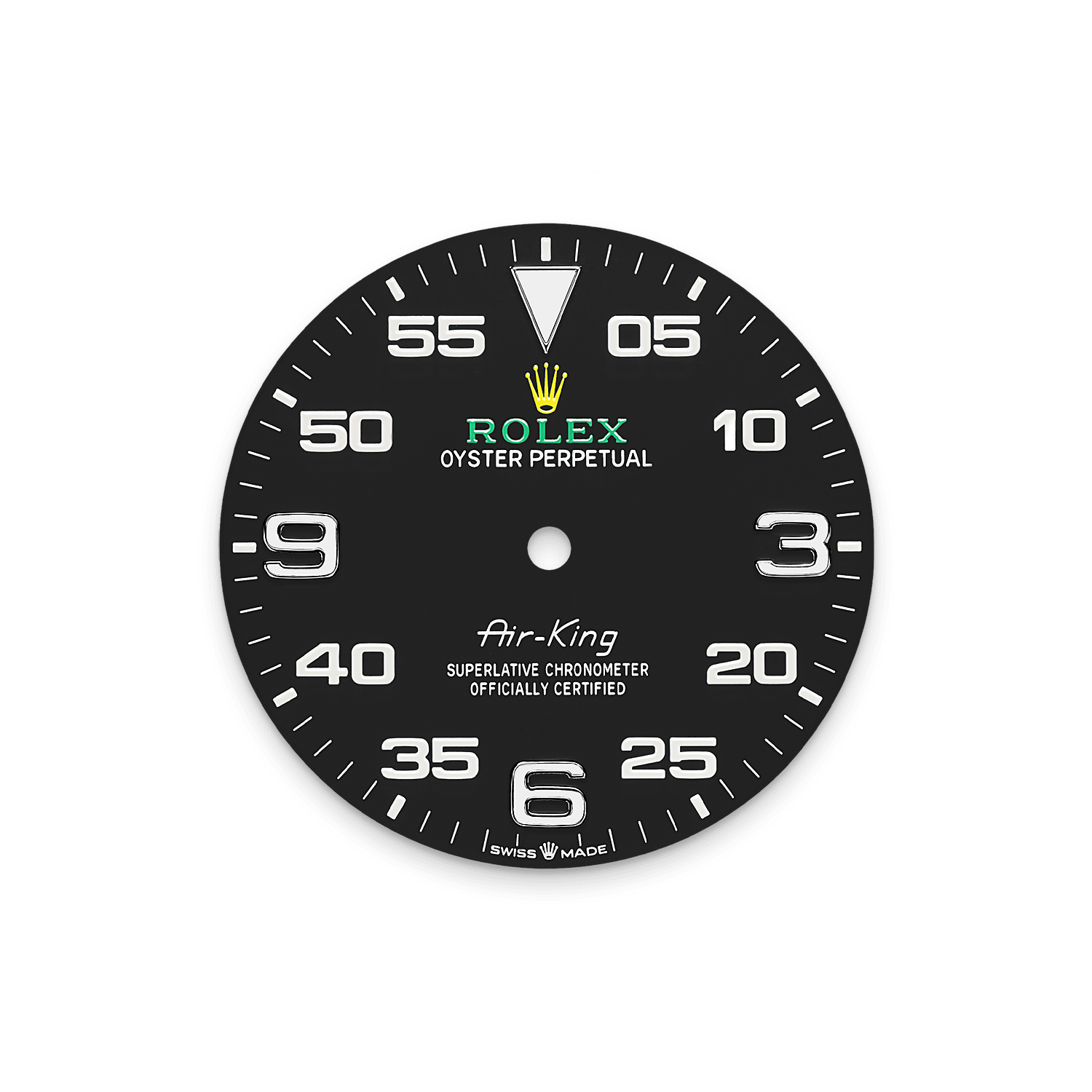 Air-King’in çarpıcı siyah kadranı, saatleri gösteren büyük 3, 6 ve 9 rakamlarını ve kolay görülür bir dakika ölçeğini bir araya getirerek seyir süresini takip etmeyi sağlar.