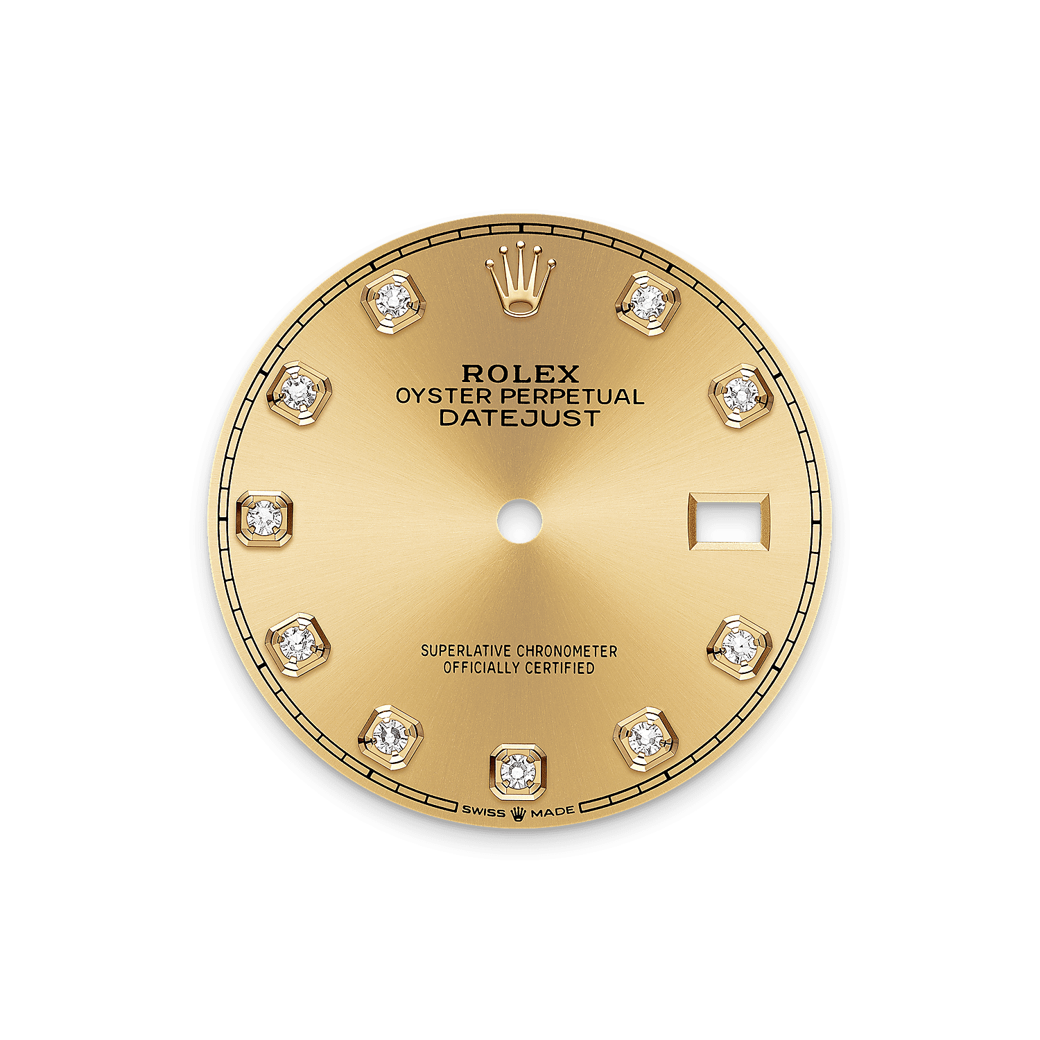 Bu kadranda 18 kt altın yuvalı pırlantalar yer alır. Parlayan güneş deseni, Oyster Perpetual koleksiyonundaki birçok kadranda zarif ışık yansımaları yaratır. Kadranın merkezinden dışarı doğru yayılan oluklar oluşturan, ustalıklı fırçalama teknikleriyle elde edilir.