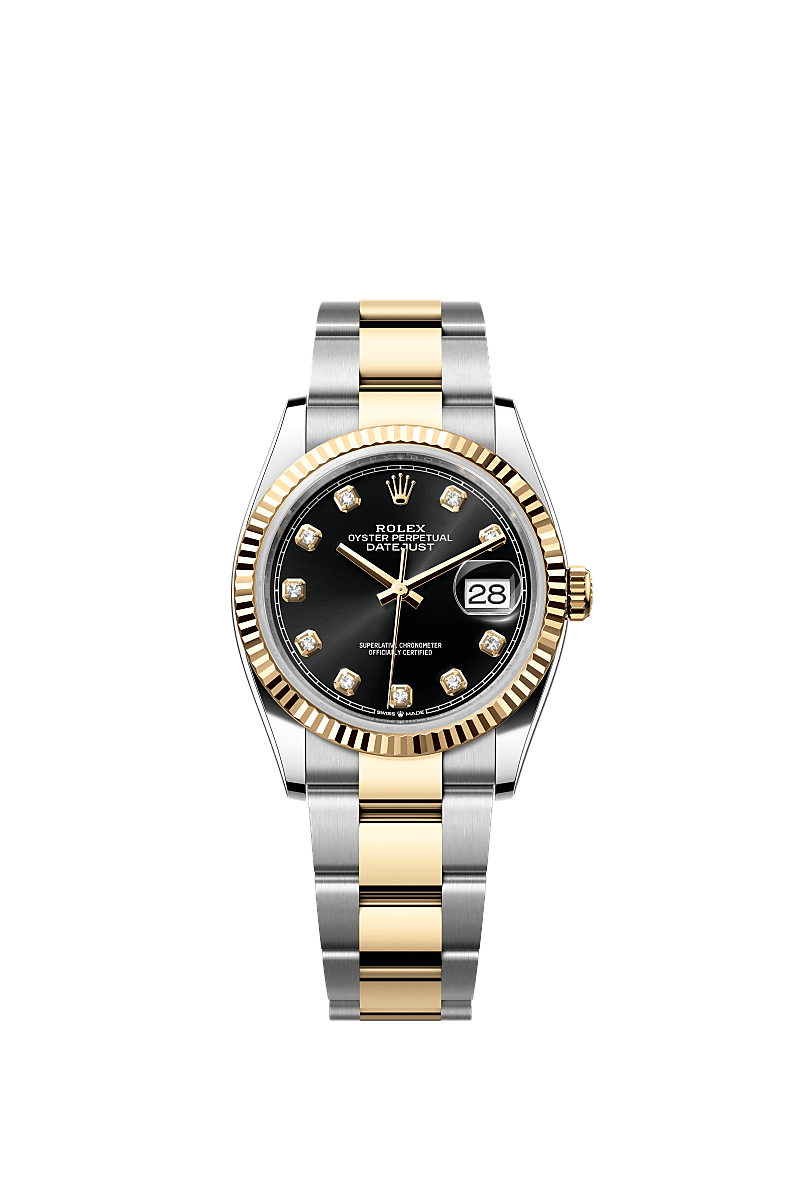 Bu Oystersteel çelik ve sarı altın Oyster Perpetual Datejust 36, pırlantalı parlak siyah kadrana ve Oyster bileziğe sahiptir.