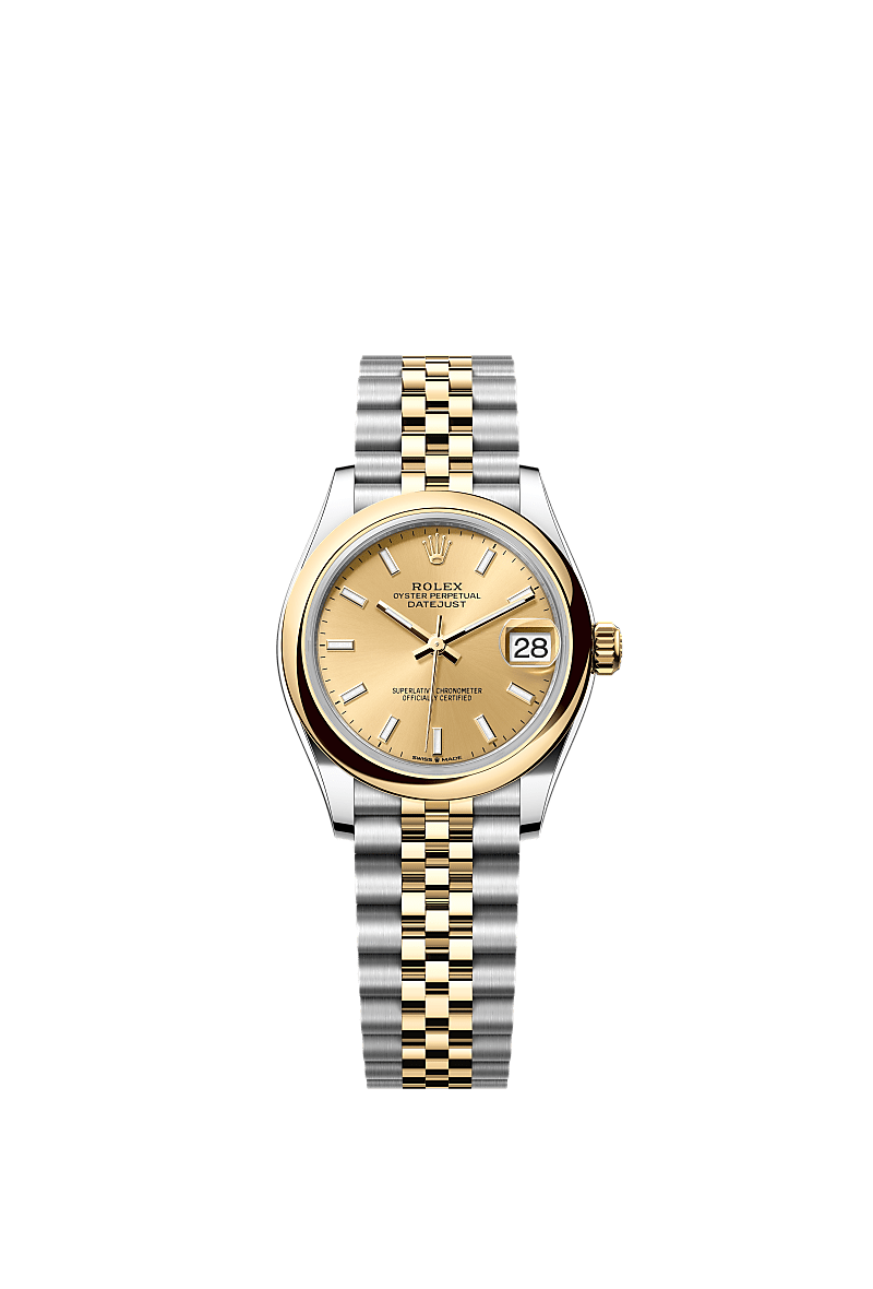 Bu Oystersteel çelik ve sarı altın Oyster Perpetual Datejust 31, şampanya rengi kadrana ve Jubilee bileziğe sahiptir.