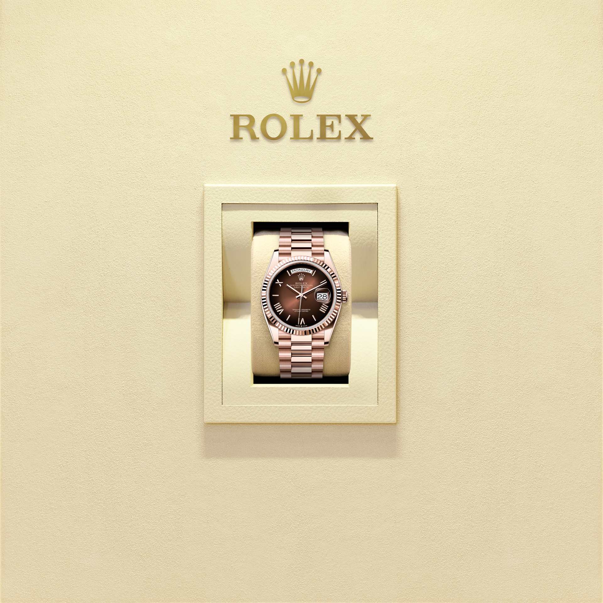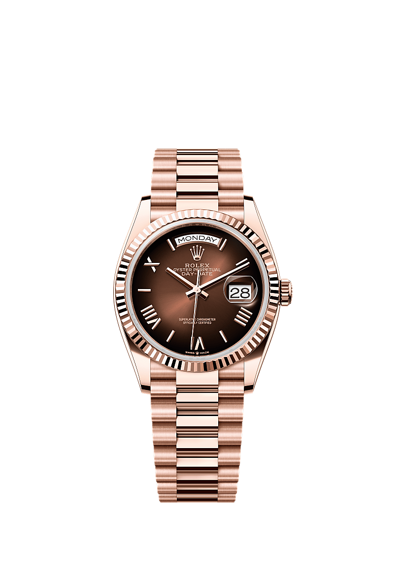 Karşınızda 18 kt Everose altın Oyster Perpetual Day-Date 36: gölgeli kahverengi kadran, yivli çerçeve ve President bilezik.