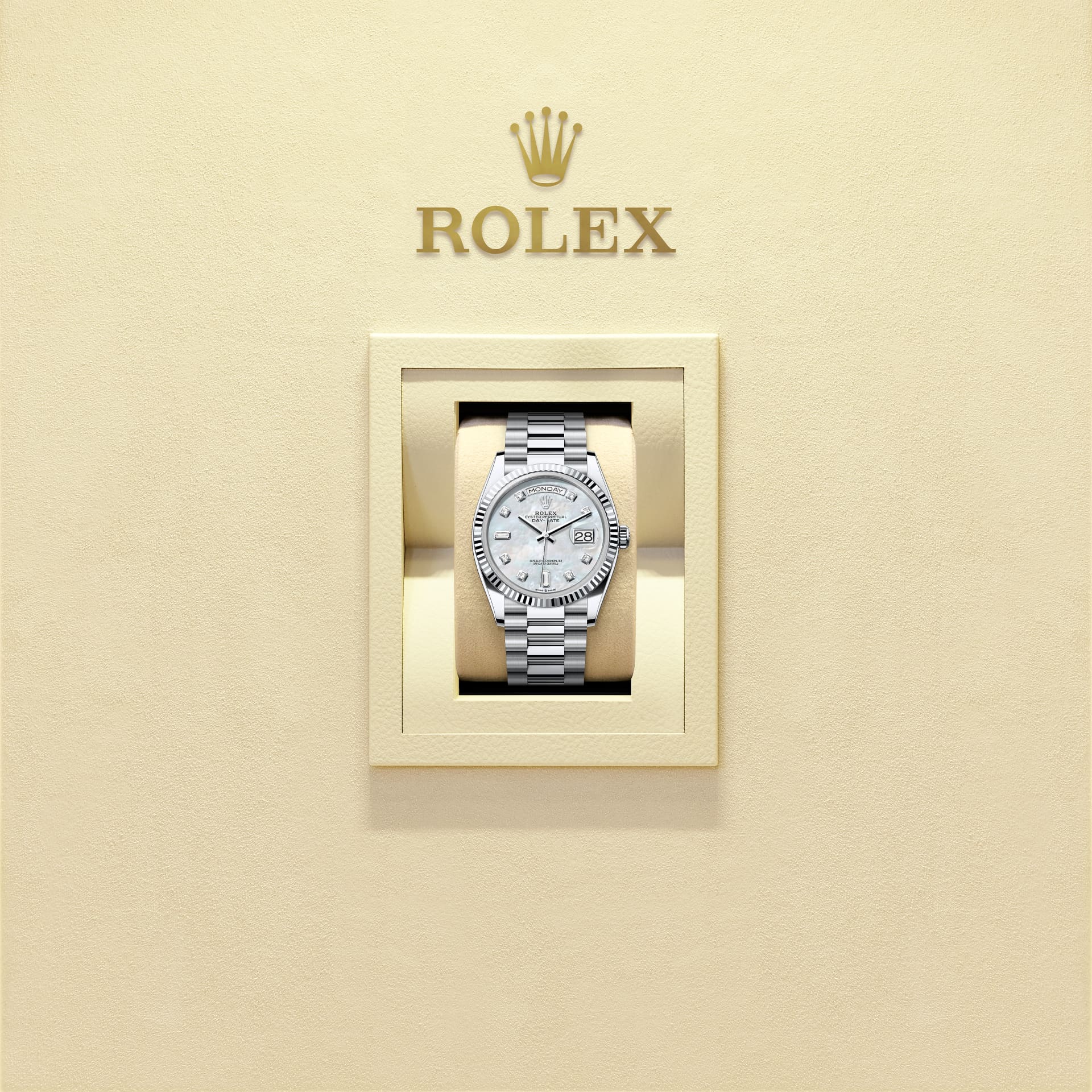 Karşınızda platin Oyster Perpetual Day-Date 36: pırlantalı beyaz sedef kadran, yivli çerçeve ve President bilezik.
