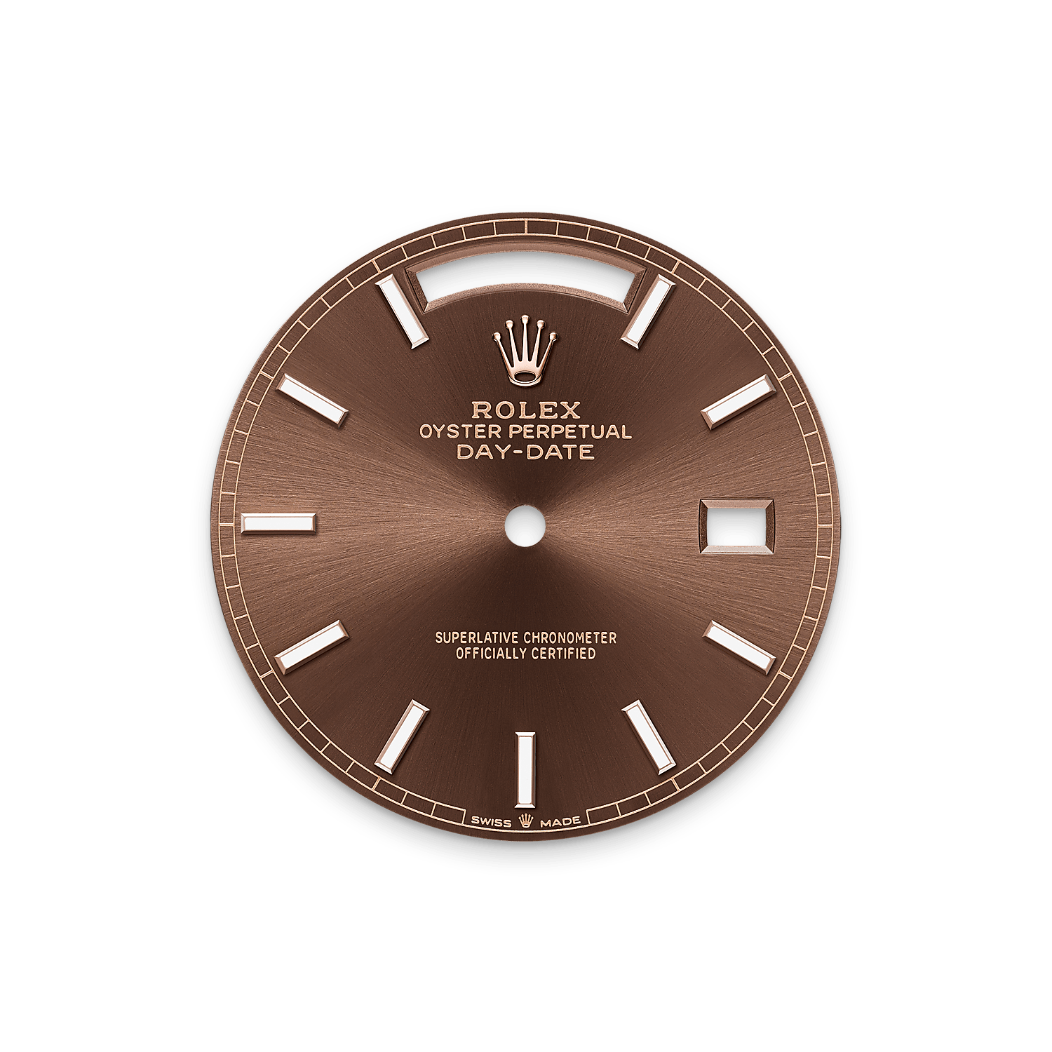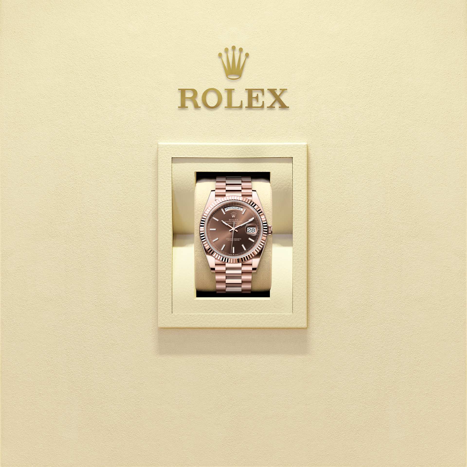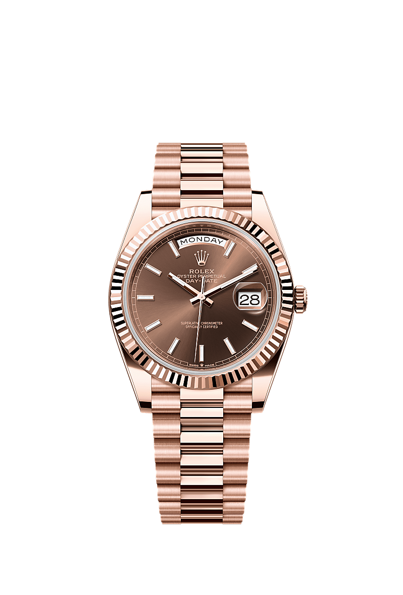 Karşınızda 18 kt Everose altın Oyster Perpetual Day-Date 40: çikolata rengi kadran, yivli çerçeve ve President bilezik.
