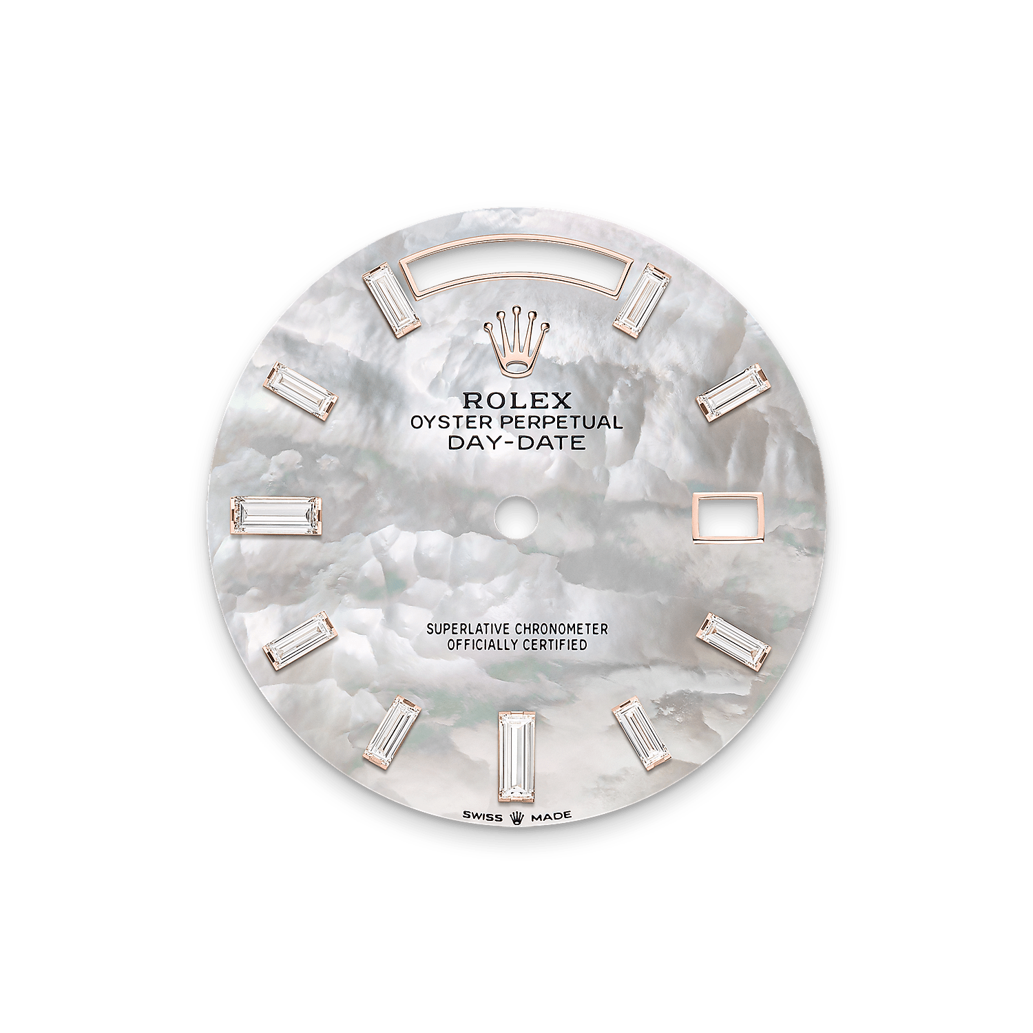 Karşınızda 18 kt Everose altın Oyster Perpetual Day-Date 40: pırlantalı beyaz sedef kadran, yivli çerçeve ve President bilezik.