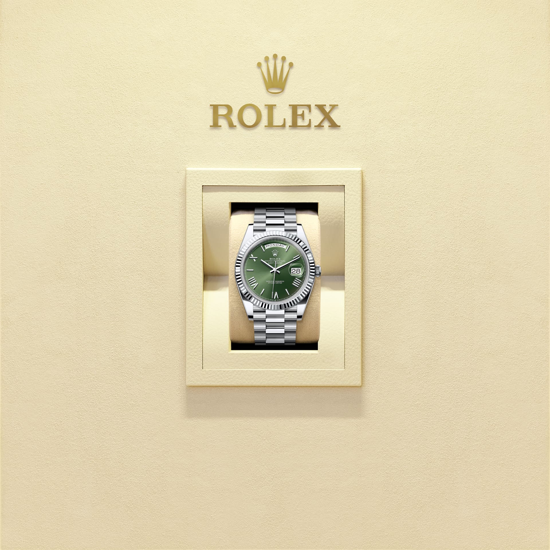 Karşınızda platin Oyster Perpetual Day-Date 40: zeytin yeşili kadran, yivli çerçeve ve President bilezik.