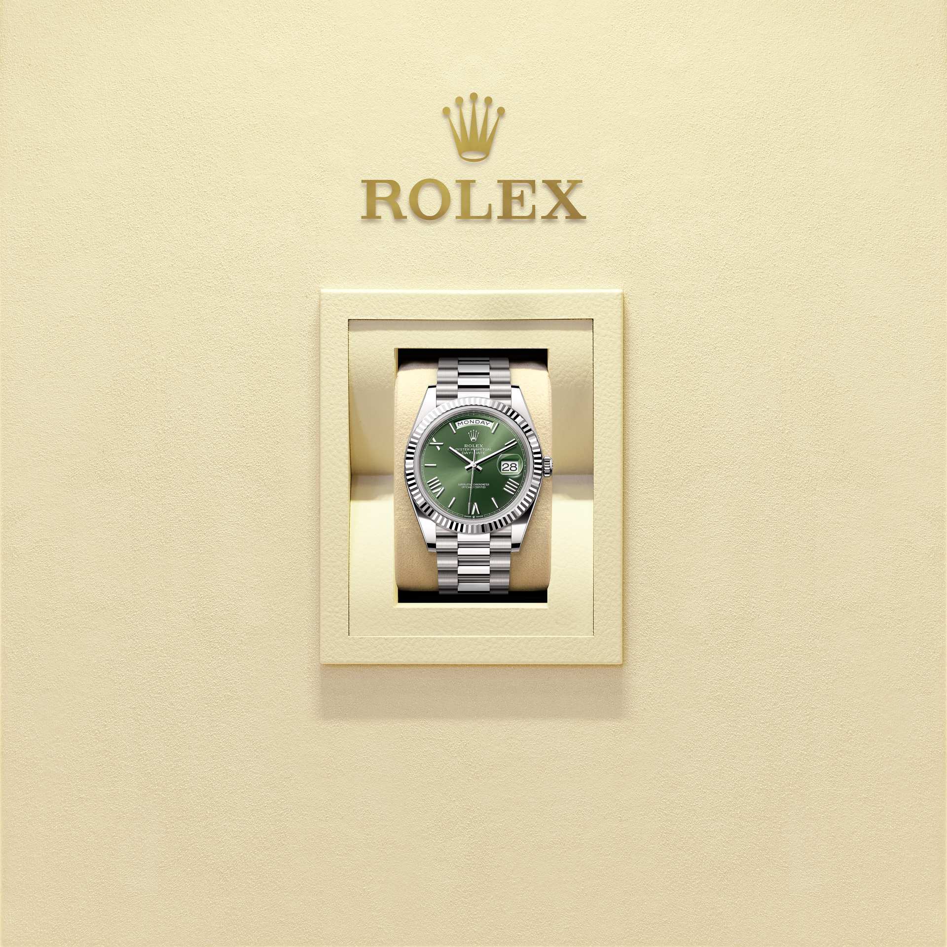 Karşınızda 18 kt beyaz altın Oyster Perpetual Day-Date 40: zeytin yeşili kadran, yivli çerçeve ve President bilezik.