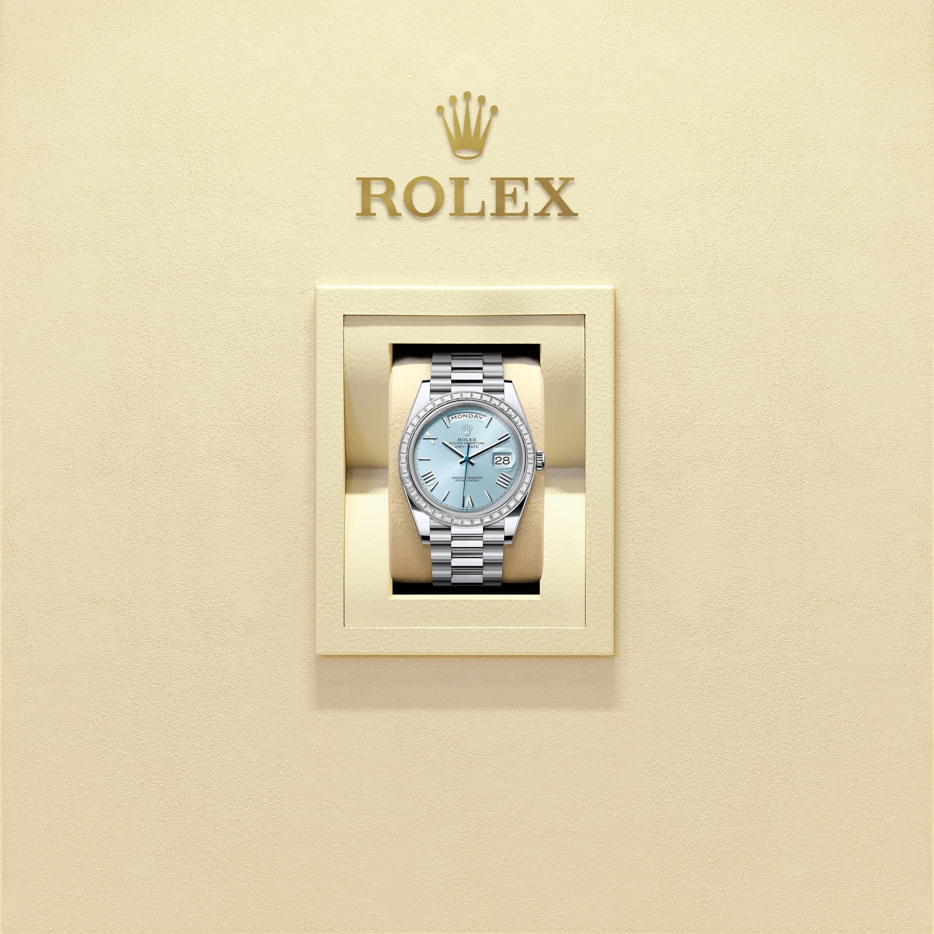 Karşınızda platin Oyster Perpetual Day-Date 40: buz mavisi kadran, pırlantalı çerçeve ve President bilezik.
