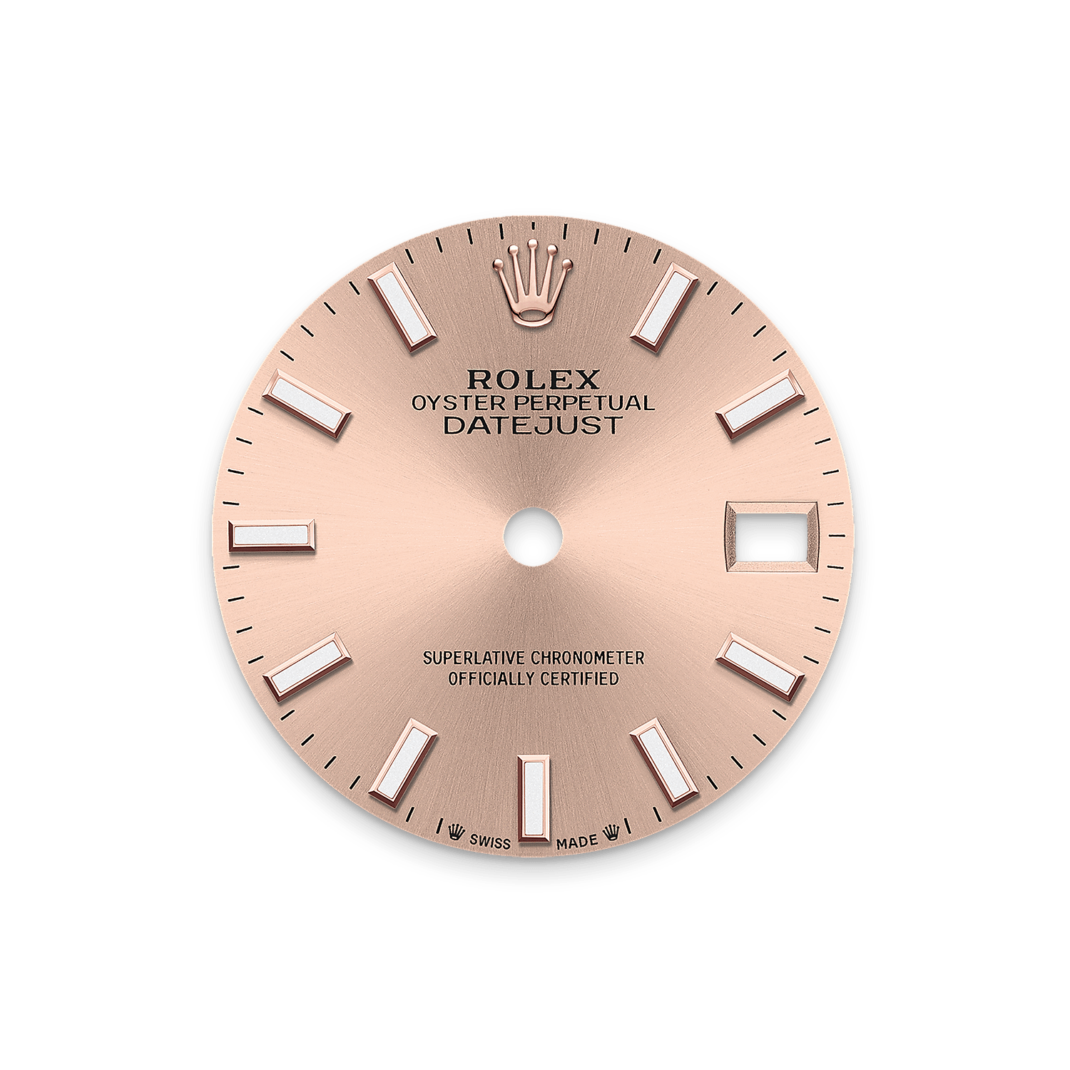 Parlayan güneş deseni, Oyster Perpetual koleksiyonundaki birçok kadranda zarif ışık yansımaları yaratır. Kadranın merkezinden dışarı doğru yayılan oluklar oluşturan, ustalıklı fırçalama teknikleriyle elde edilir.