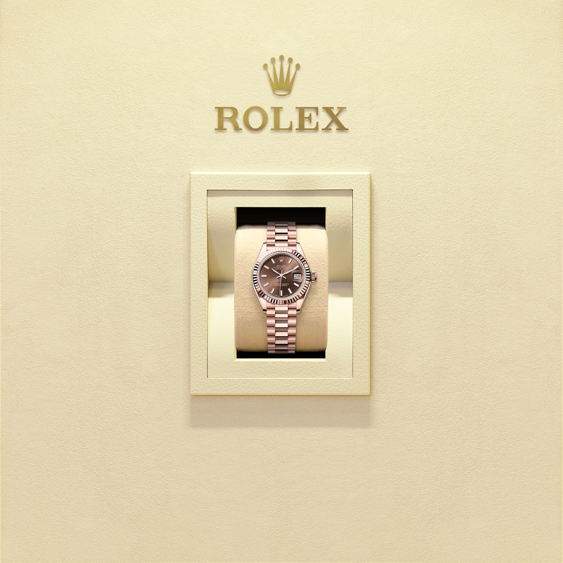 Bu 18 kt Everose altın Oyster Perpetual Lady-Datejust, çikolata rengi kadrana ve President bileziğe sahiptir.