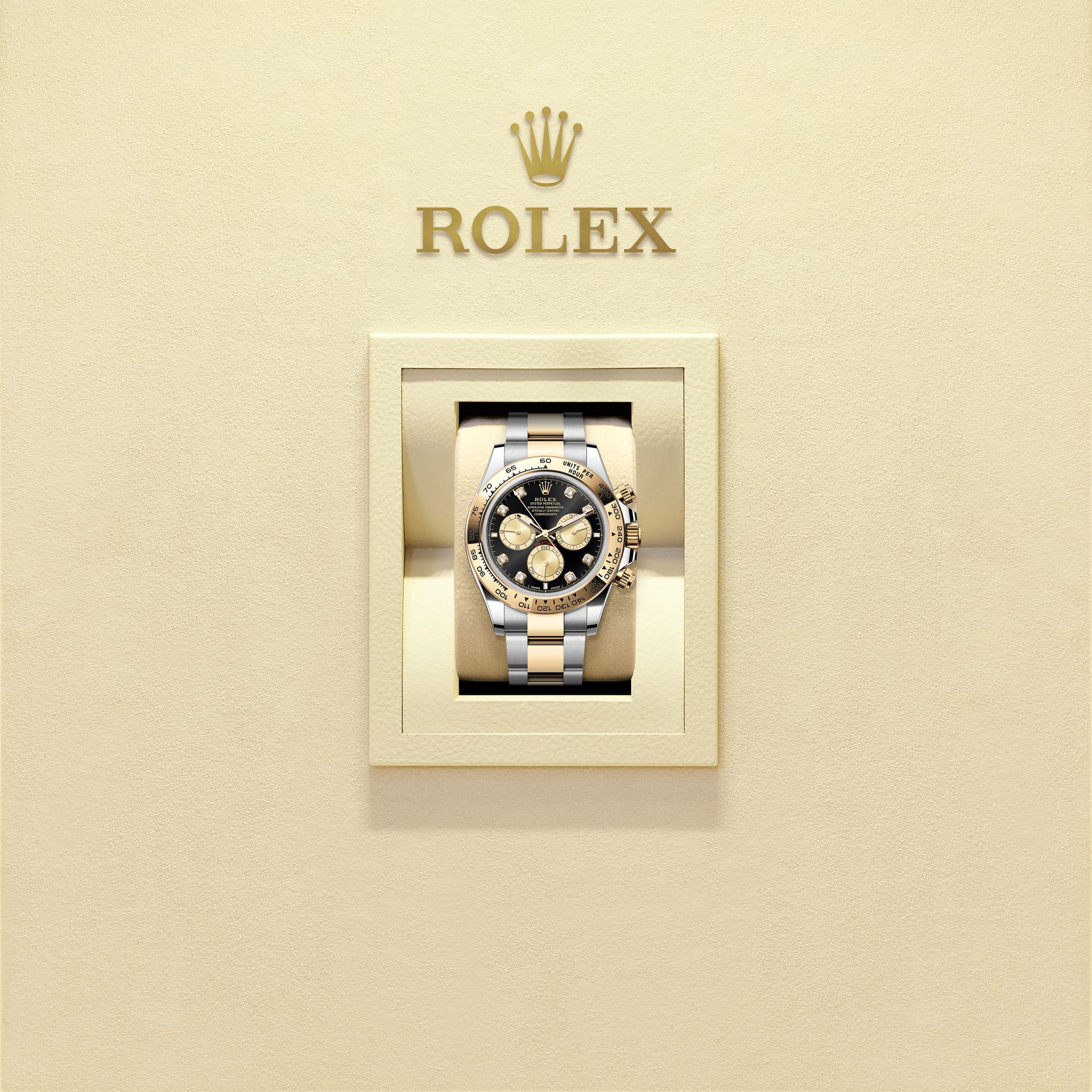 Mẫu Oyster Perpetual Cosmograph Daytona này chế tác từ thép Oystersteel và vàng kim với mặt đồng hồ màu đen sáng và vàng kim, nạm kim cương và dây đeo Oyster, tích hợp vành đồng hồ vàng kim và khắc thang đo tachymetric.
