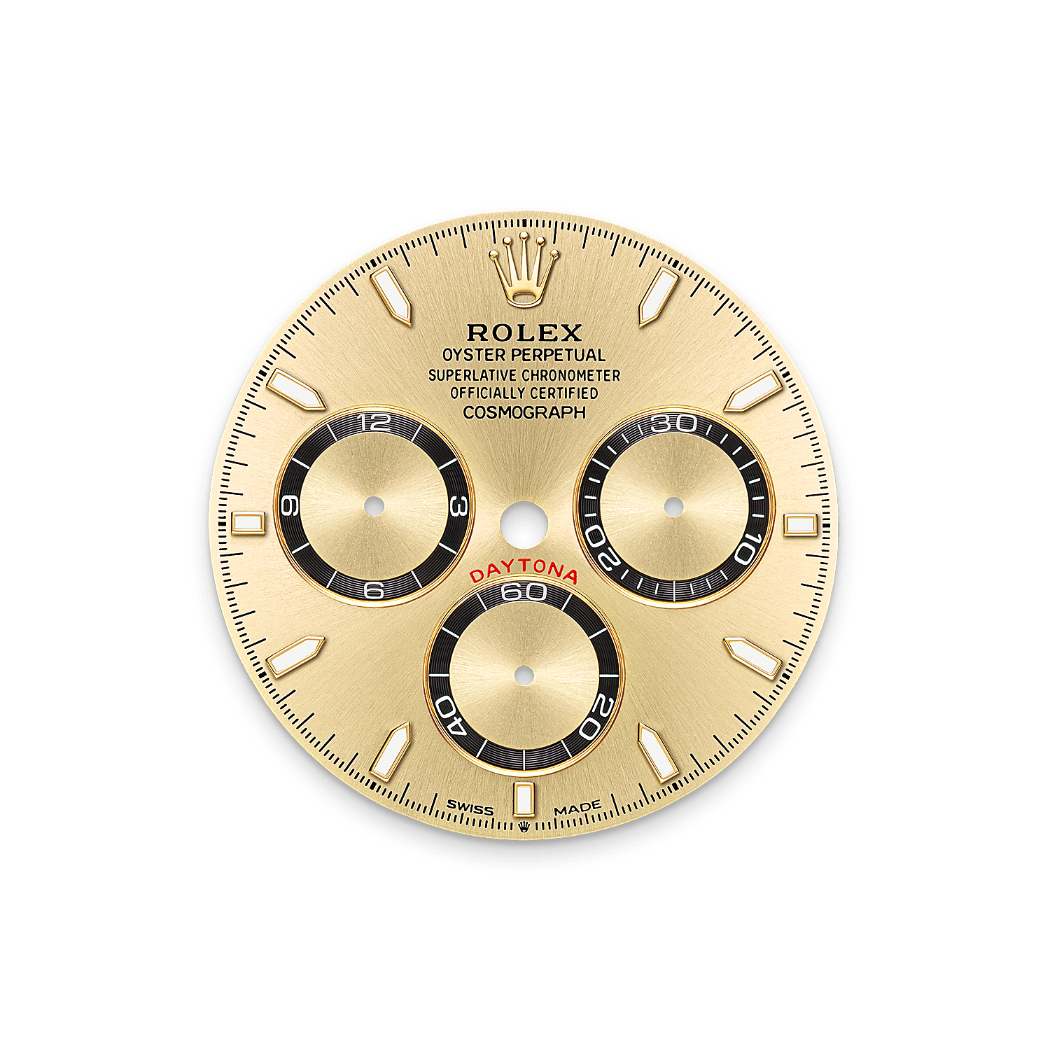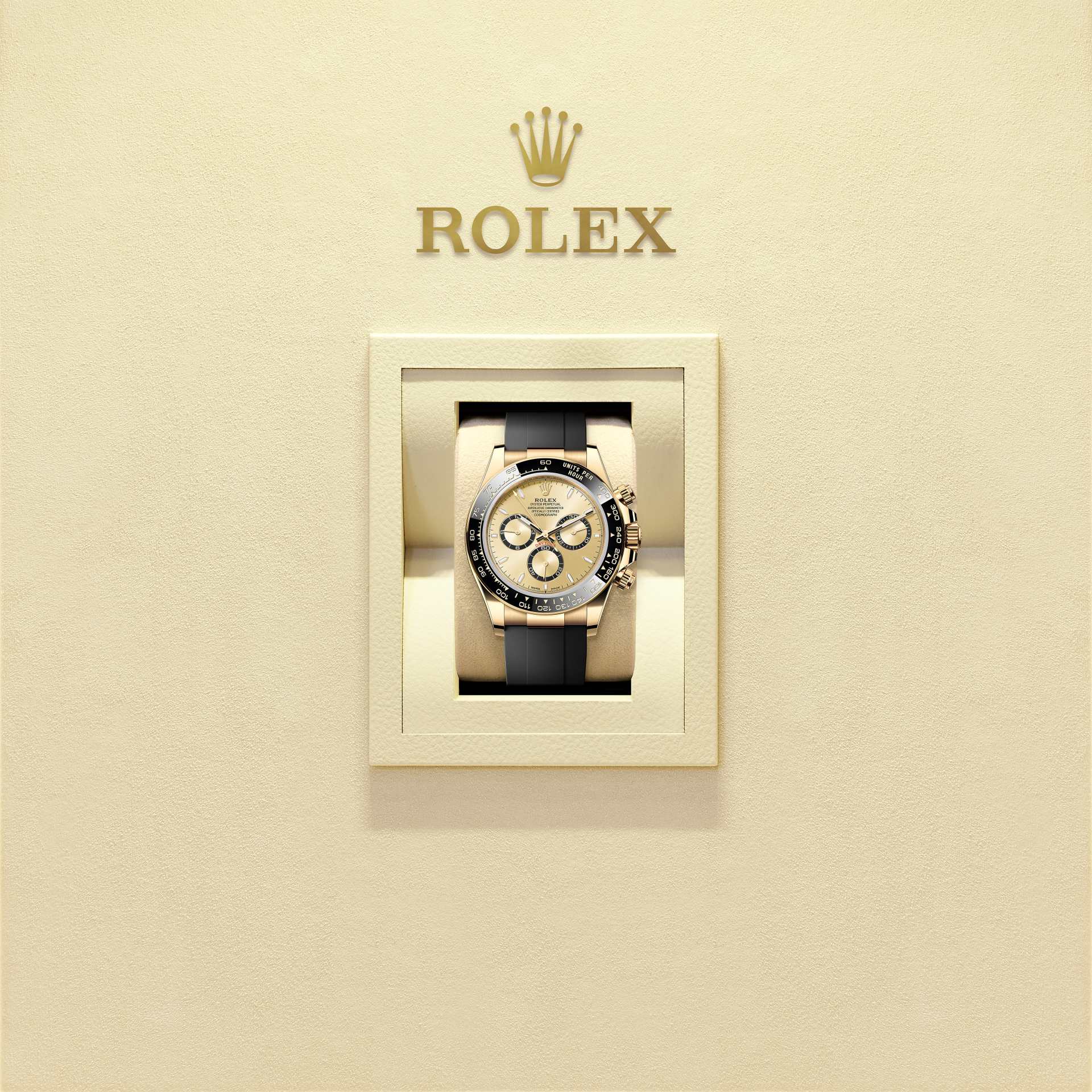 Oyster Perpetual Cosmograph Daytona chế tác từ vàng kim 18 ct với mặt đồng hồ màu vàng kim và các vòng bộ đếm tương phản. Được phối với dây đeo Oysterflex, tích hợp vành đồng hồ Cerachrom đen và khắc thang đo tachymetric.