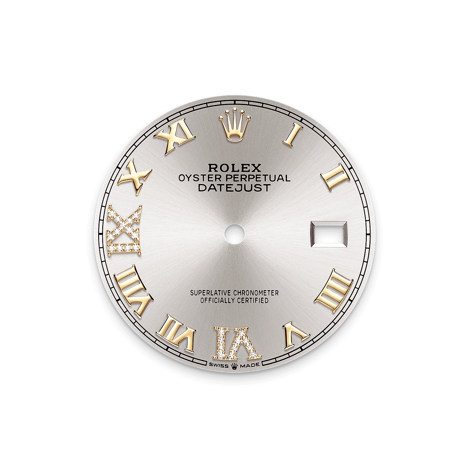 Mặt đồng hồ đi kèm chữ số La mã “VI” và “IX” bằng vàng 18 ct, nạm 24 viên kim cương. Hiệu ứng tia mặt trời tạo ra sự phản chiếu ánh sáng tinh tế trên nhiều mẫu mặt đồng hồ của bộ sưu tập Oyster Perpetual. Phương pháp sử dụng các kỹ thuật chải thành thạo tạo ra các rãnh hướng từ trung tâm của mặt đồng hồ ra ngoài.