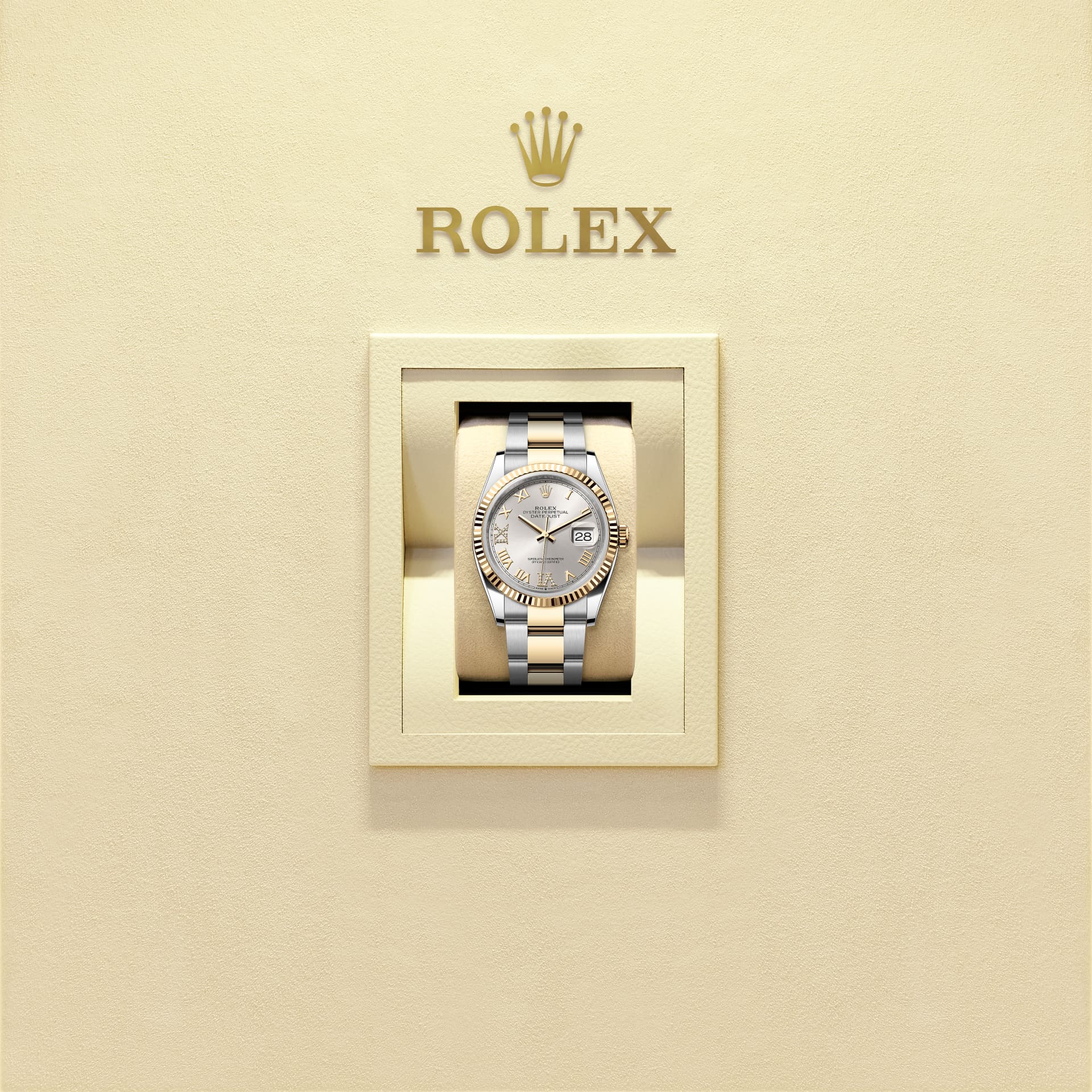Đồng hồ Oyster Perpetual Datejust 36 bằng thép Oystersteel và vàng kim đi kèm mặt số màu bạc, nạm kim cương và dây đeo Oyster.