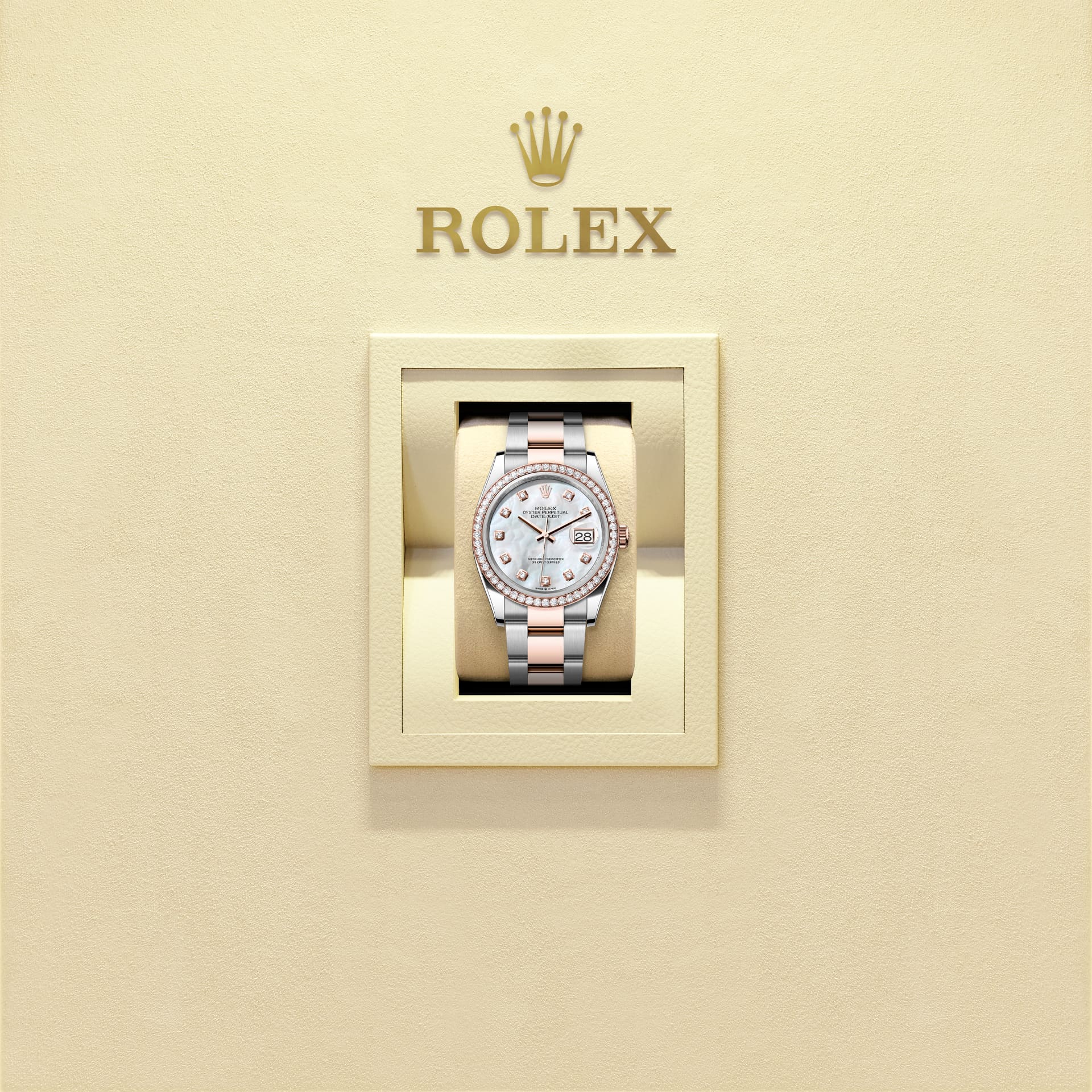 Đồng hồ Oyster Perpetual Datejust 36 bằng thép Oystersteel và vàng Everose đi kèm mặt số mặt số vỏ trai trắng nạm kim cương và dây đeo Oyster.