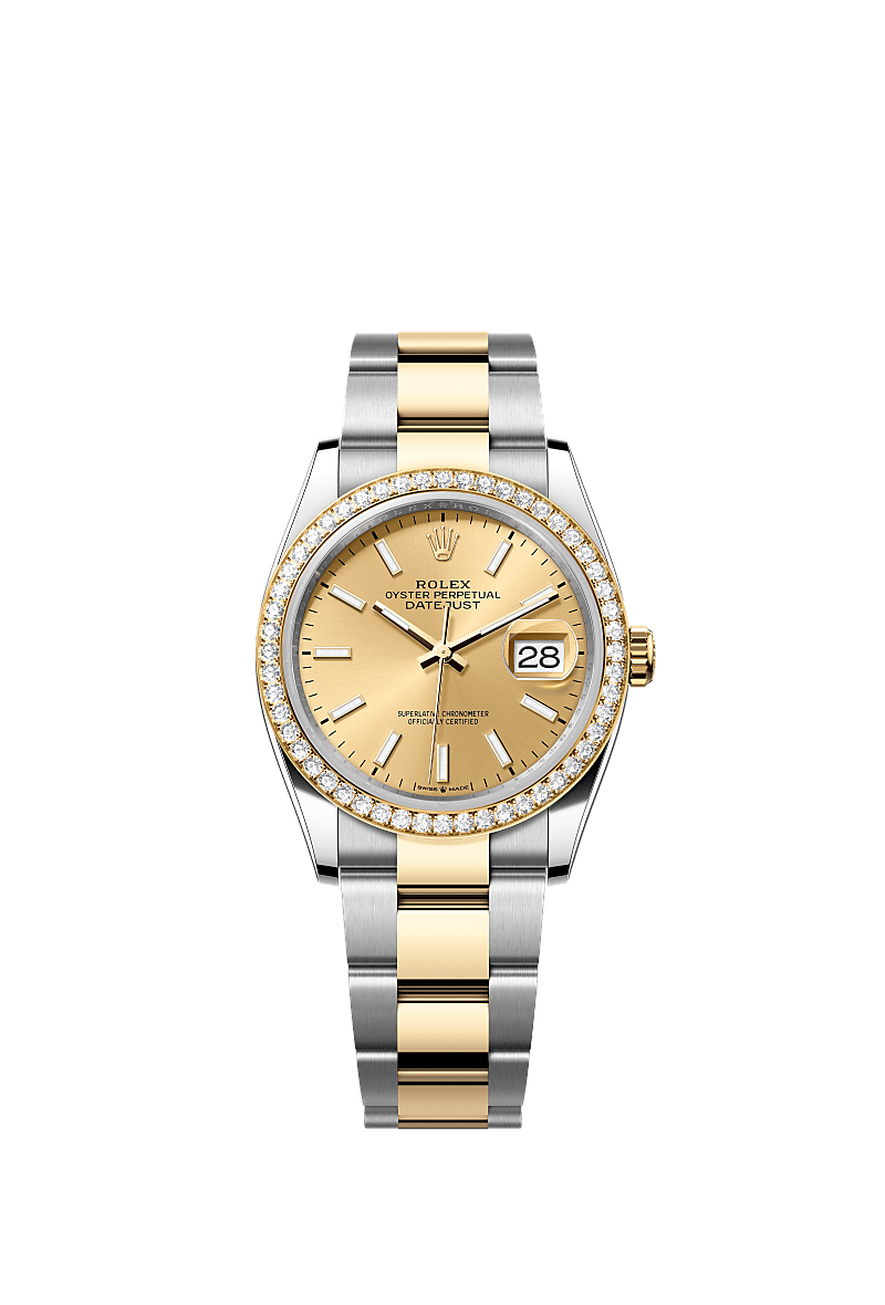 Đồng hồ Oyster Perpetual Datejust 36 bằng thép Oystersteel và vàng kim đi kèm mặt số màu Champagne và dây đeo Oyster.