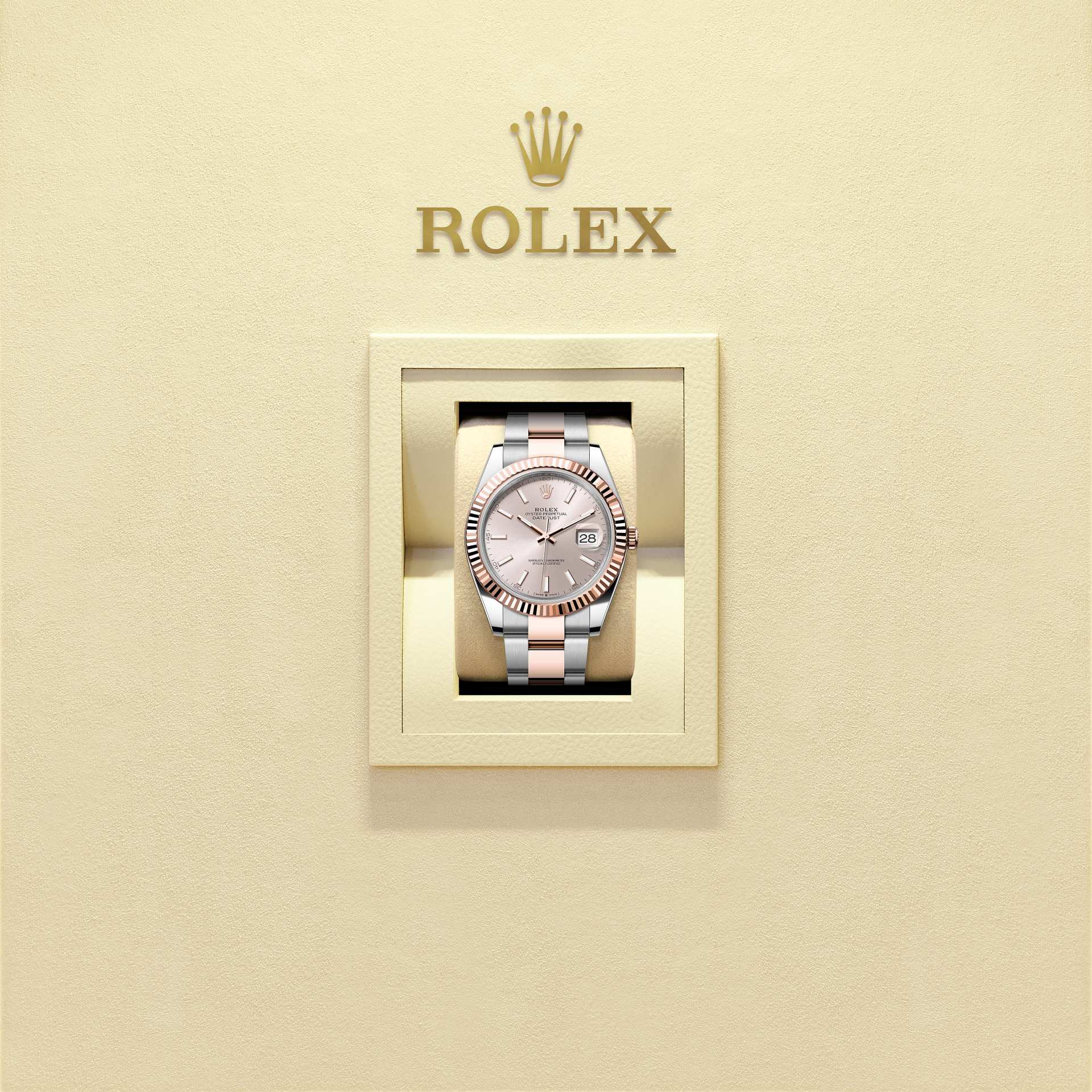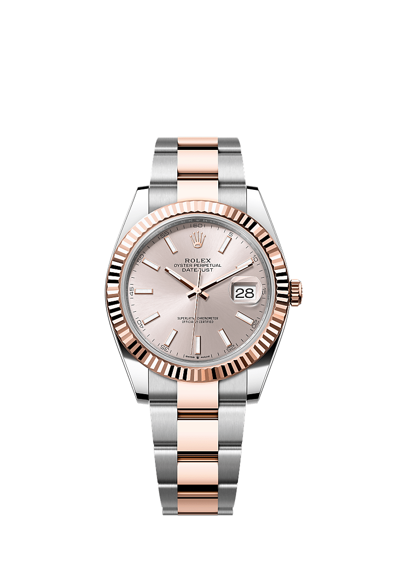 Đồng hồ Oyster Perpetual Datejust 41 bằng thép Oystersteel và vàng Everose đi kèm mặt số sundust và dây đeo Oyster.