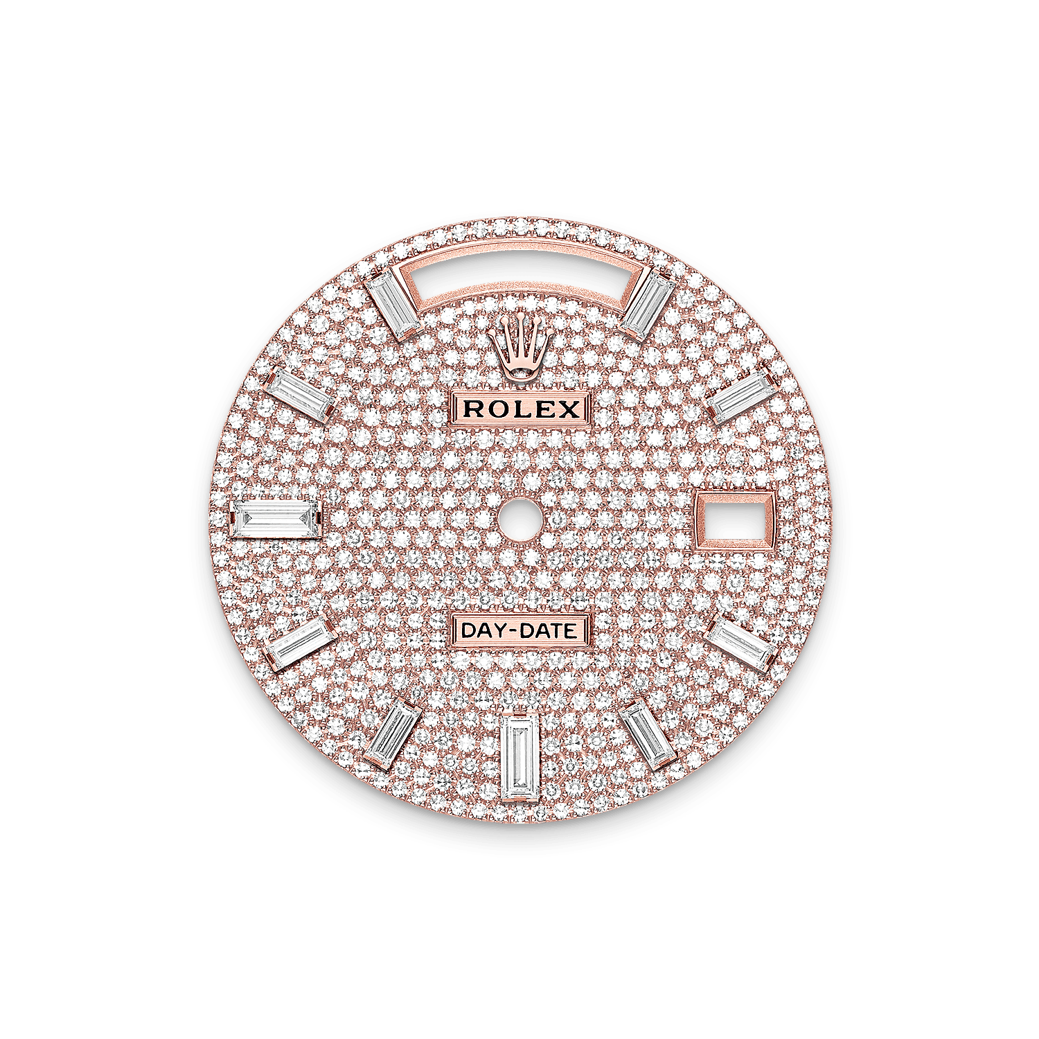 Mặt đồng hồ phối 10 lát cắt kim cương hình chữ nhật. Kim cương, sapphire, hồng ngọc, ngọc lục bảo – những loại đá quý quý giá nhất được lựa chọn để tô điểm cho những chiếc đồng hồ Rolex. Thương hiệu có chuyên môn và trang thiết bị hiện đại tại xưởng của mình, cho phép hãng có thể trang trí bất kỳ mẫu đồng hồ nào trong danh mục của mình.