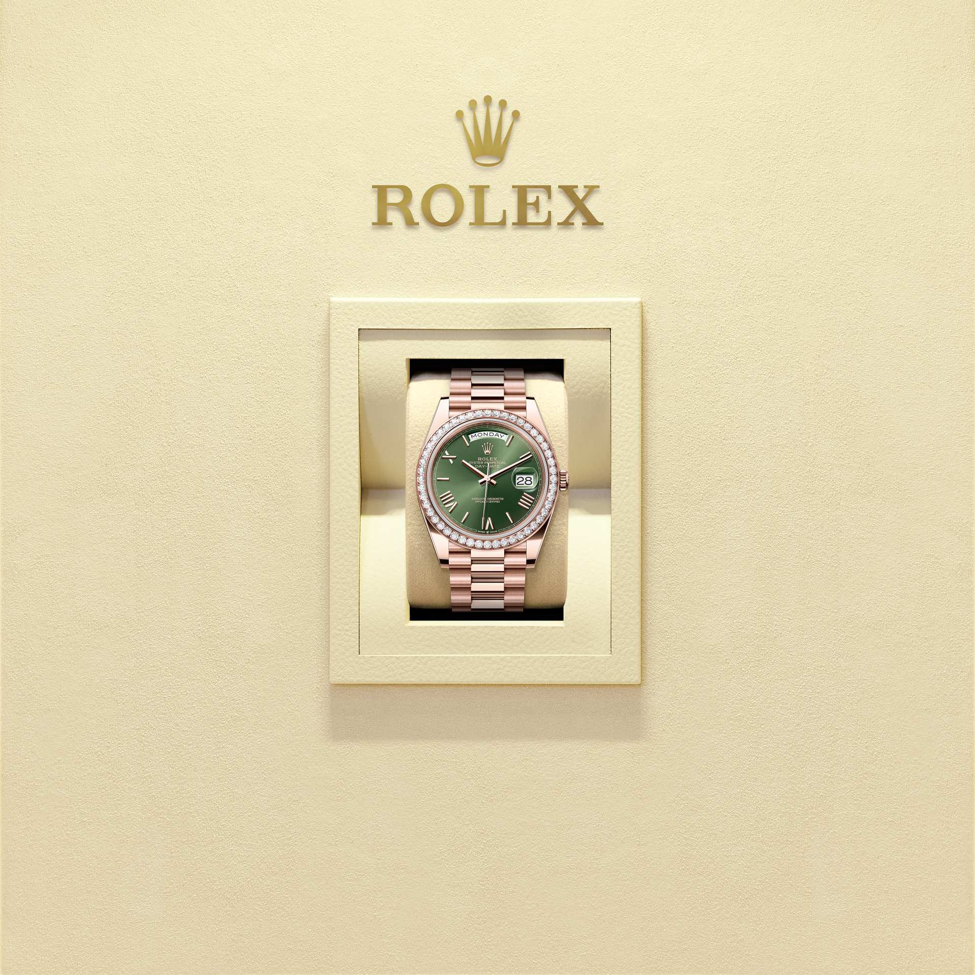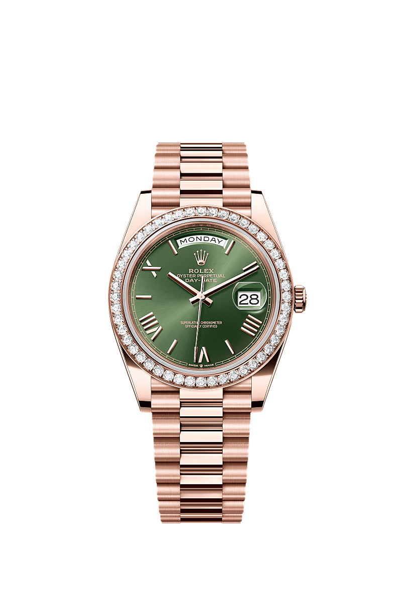 Đồng hồ Oyster Perpetual Day-Date 40 bằng vàng Everose 18 ct với mặt số màu xanh olive, vành đồng hồ Nạm kim cương và dây đeo President.