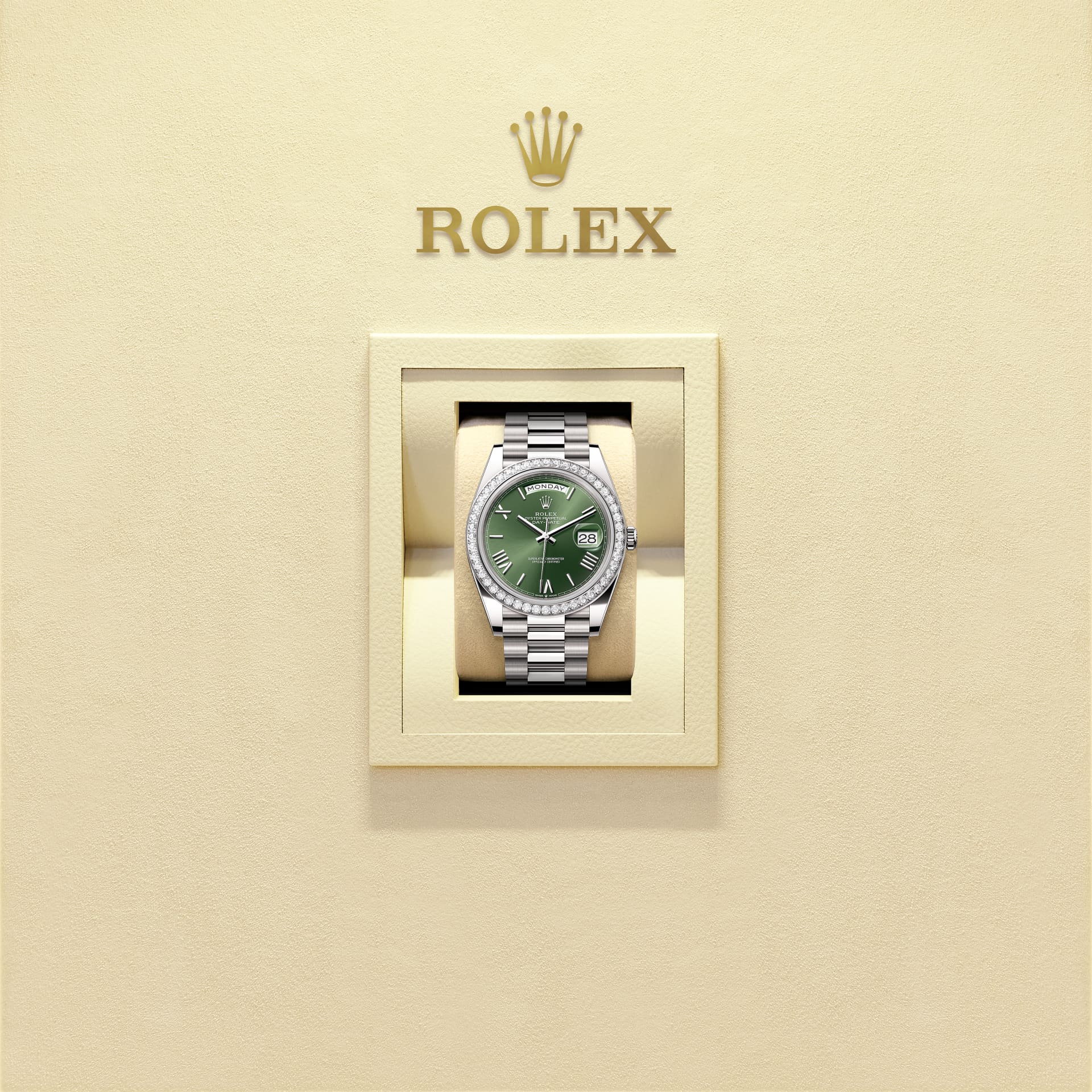 Đồng hồ Oyster Perpetual Day-Date 40 bằng vàng trắng 18ct với mặt số màu xanh olive, vành đồng hồ Nạm kim cương và dây đeo President.