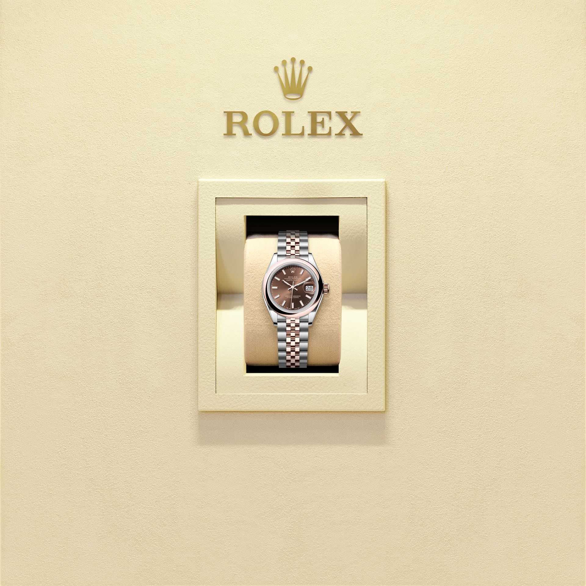 Oyster Perpetual Lady-Datejust bằng thép Oystersteel và vàng Everose đi kèm mặt đồng hồ màu chocolate và dây đeo Jubilee.