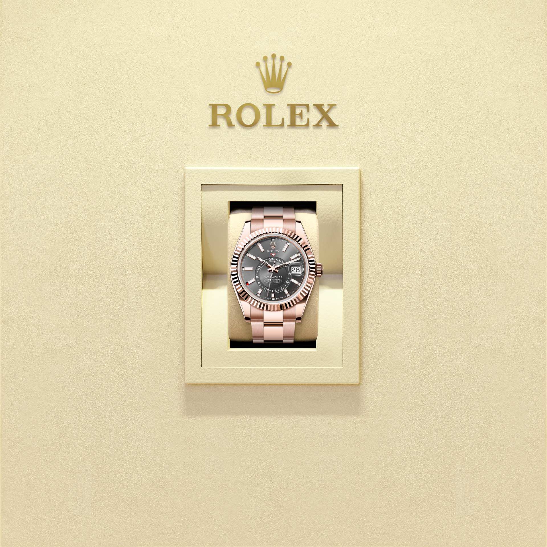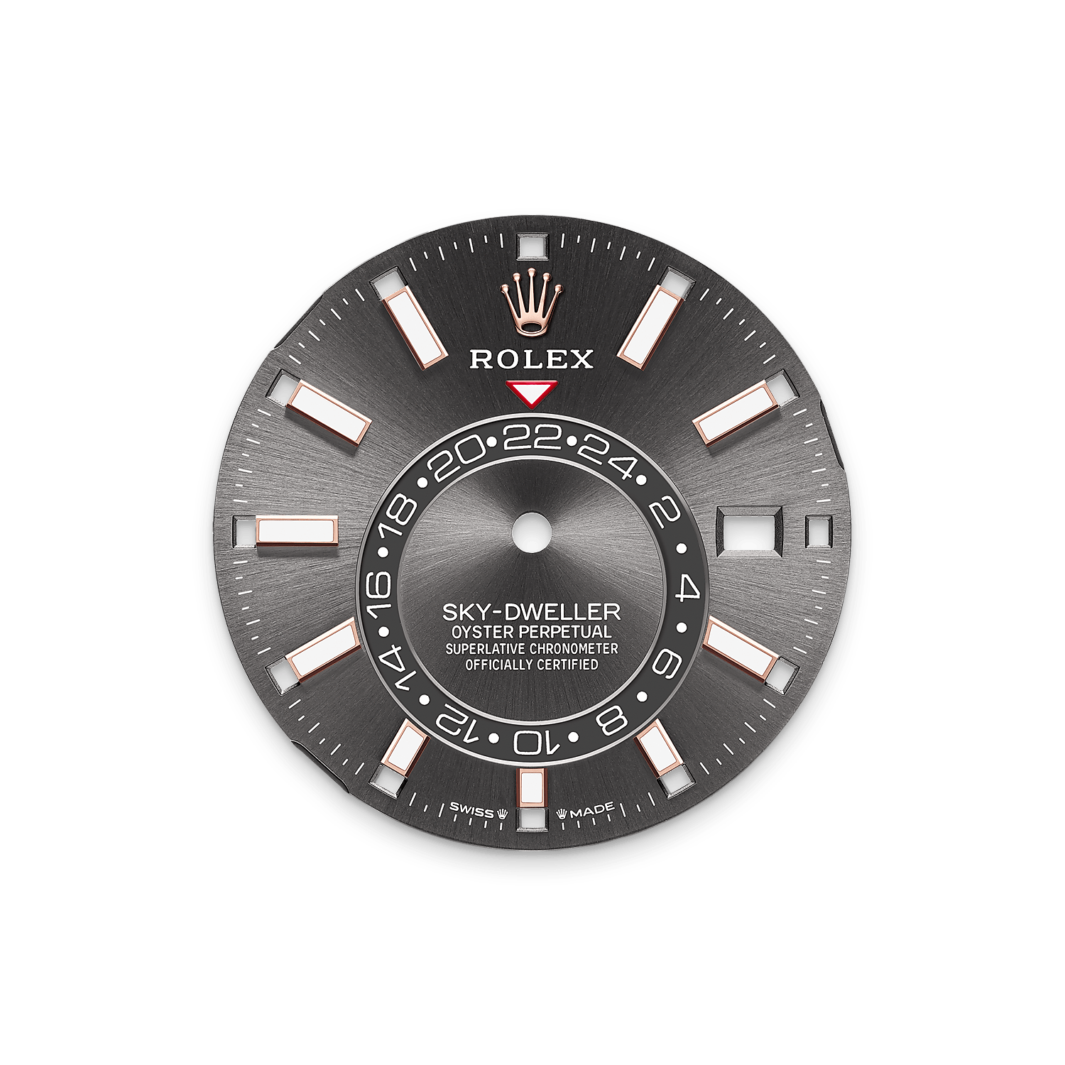 Oyster Perpetual Sky-Dweller bằng vàng Everose 18 ct với mặt đồng hồ slate và dây đeo Oyster.