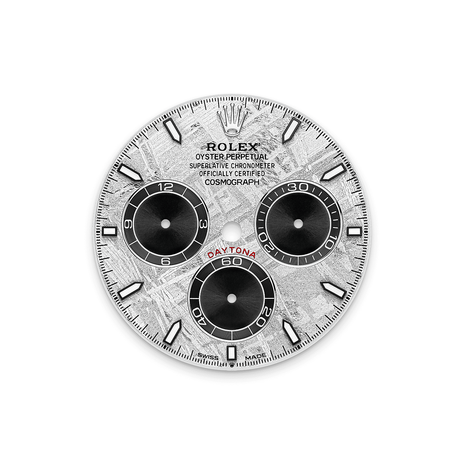This model is the only Cosmograph Daytona with a meteorite dial. Meteorite comes from the heart of an asteroid or possibly even a planet that has exploded, propelling material across the Solar System until chance brings it into our planet’s orbit and gravity pulls it to Earth.