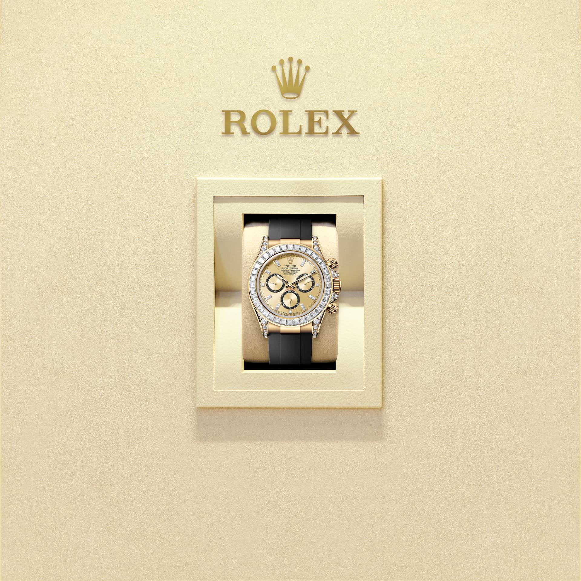 This Oyster Perpetual Cosmograph Daytona in 18 ct yellow gold, with a golden, diamond-set dial and contrasting counter rings, features an Oysterflex bracelet as well as a diamond-set bezel and diamond-set lugs.