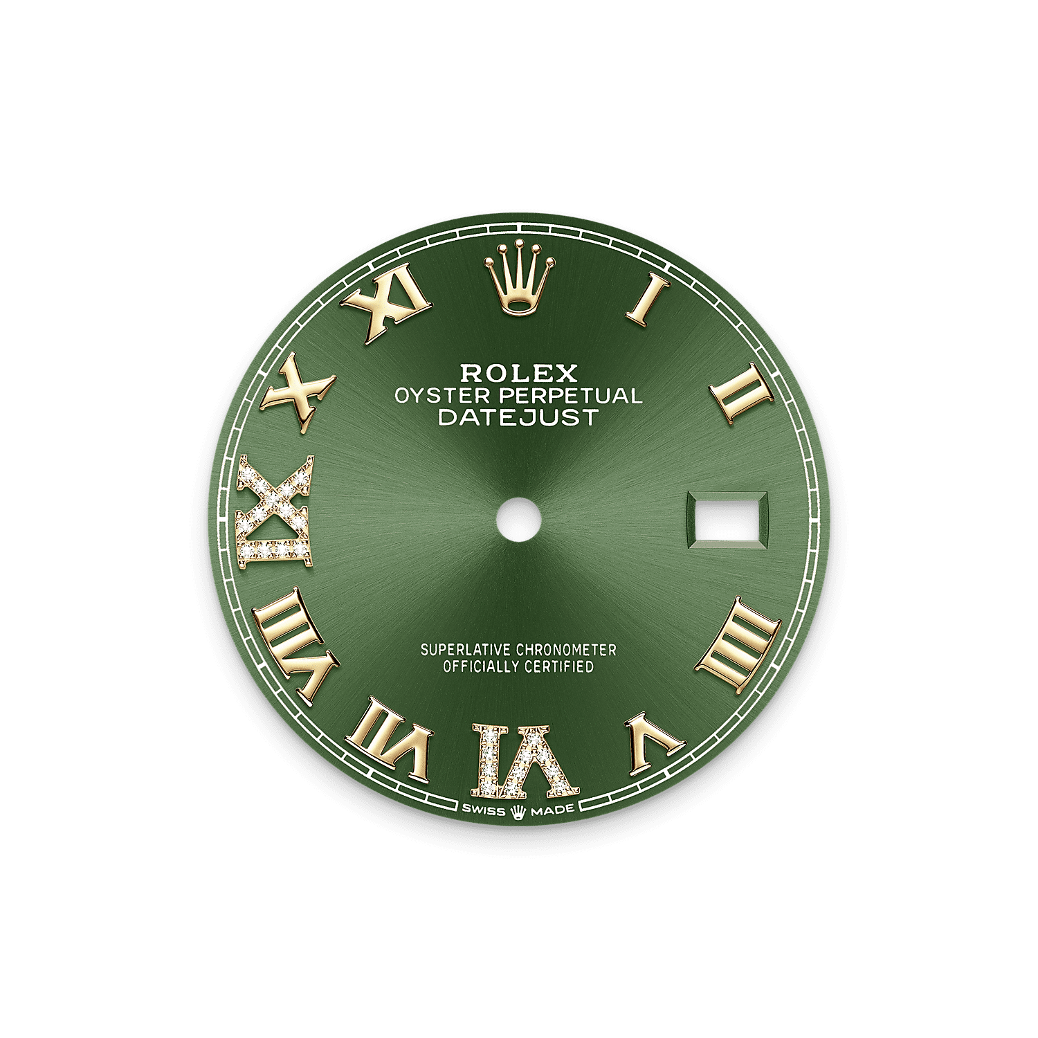 This dial features a Roman VI and IX in 18 ct gold, set with 24 diamonds. The sunray finish creates delicate light reflections on many dials in the Oyster Perpetual collection. It is obtained using masterful brushing techniques that create grooves running outwards from the centre of the dial.