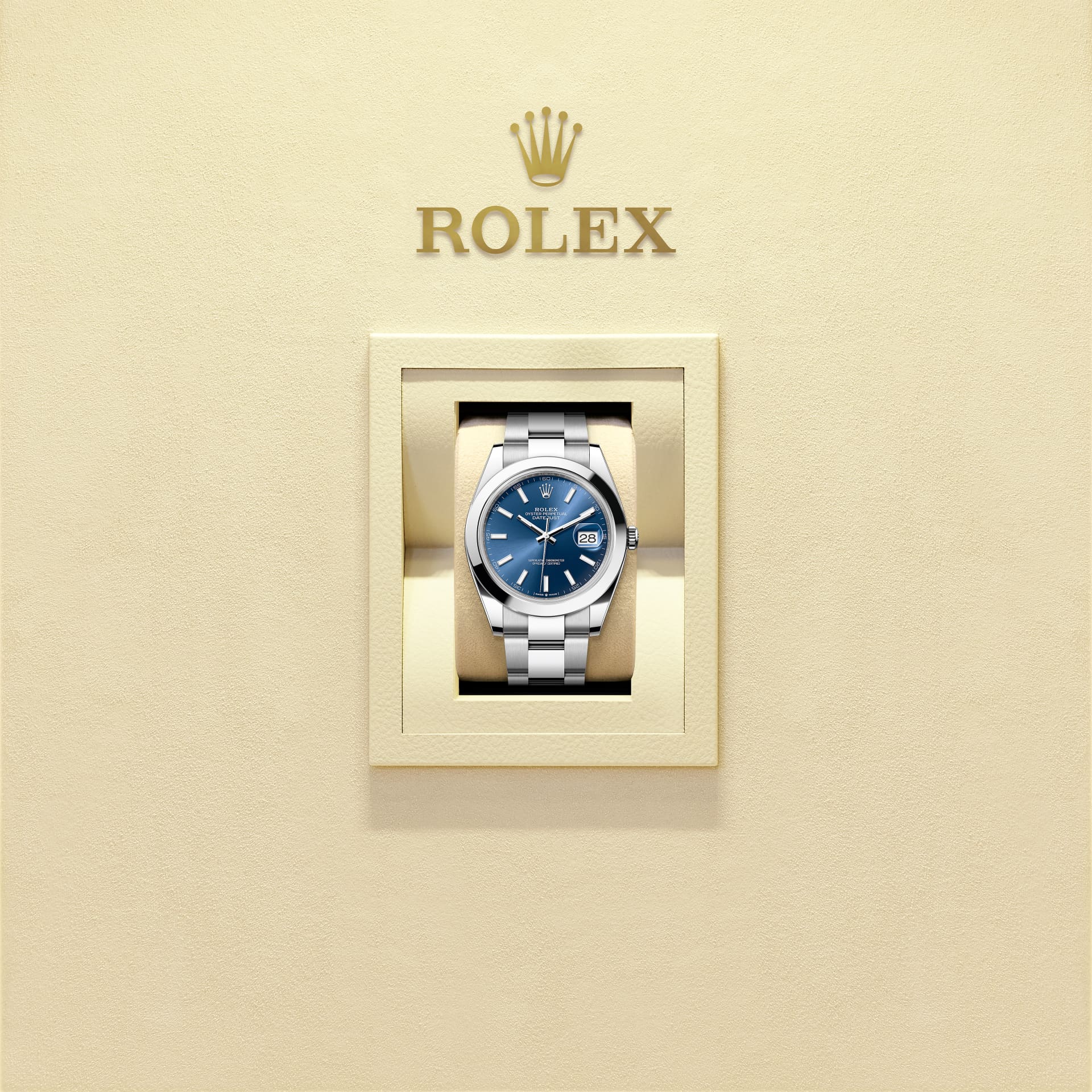 This Oyster Perpetual Datejust 41 in Oystersteel features a bright blue dial and an Oyster bracelet.