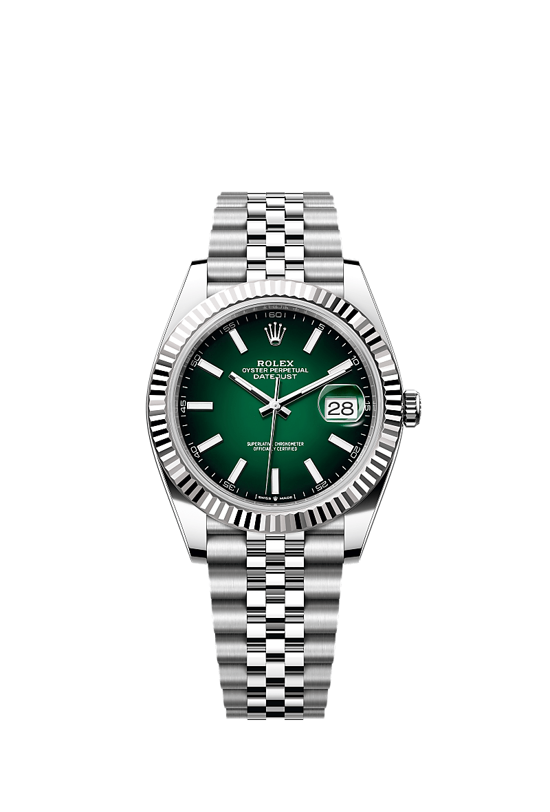 This Oyster Perpetual Datejust 41 in Oystersteel and white gold features a green ombré dial and a Jubilee bracelet.