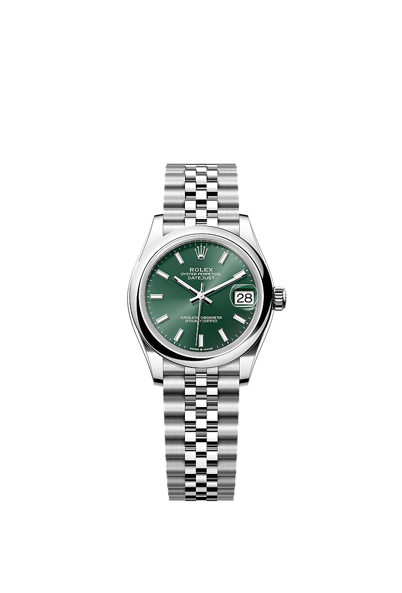 This Oyster Perpetual Datejust 31 in Oystersteel features a mint green dial and a Jubilee bracelet.