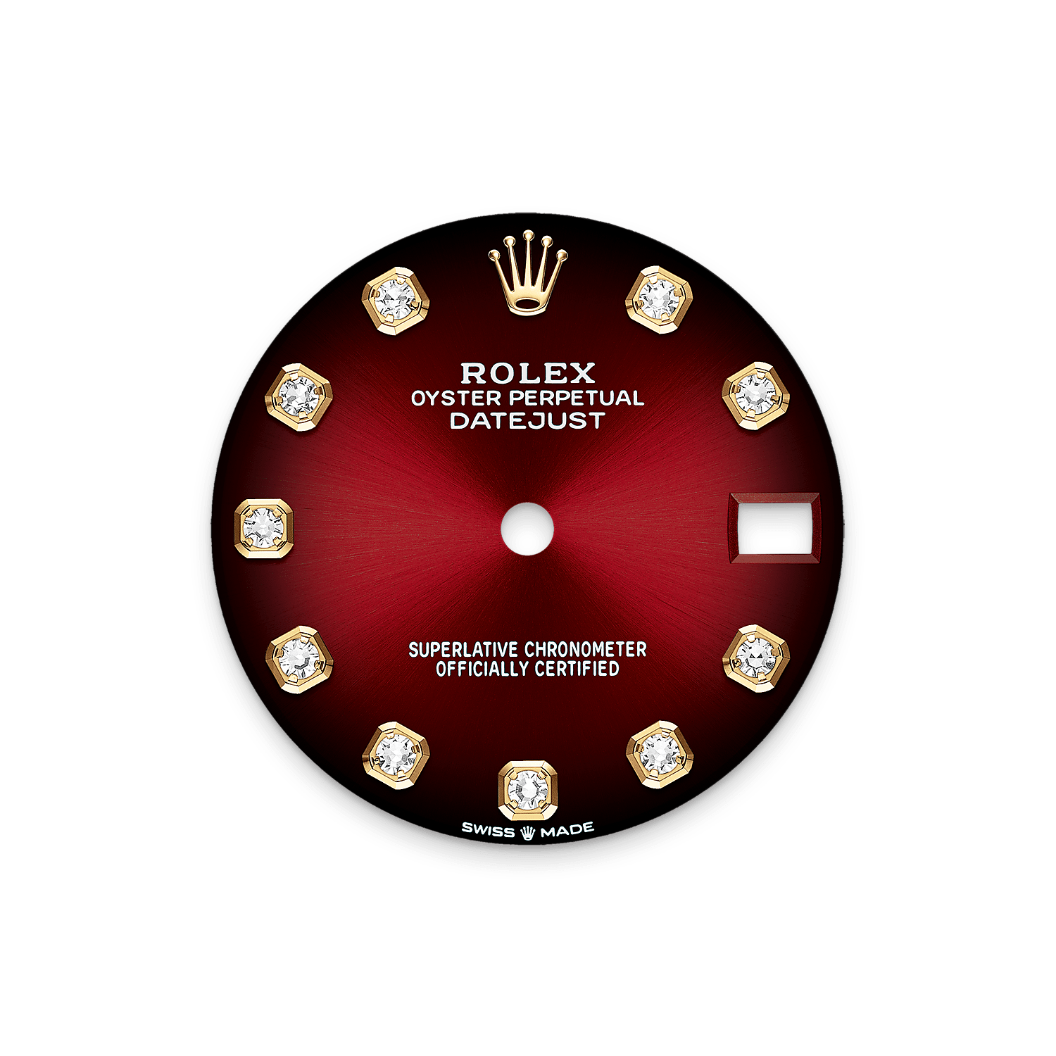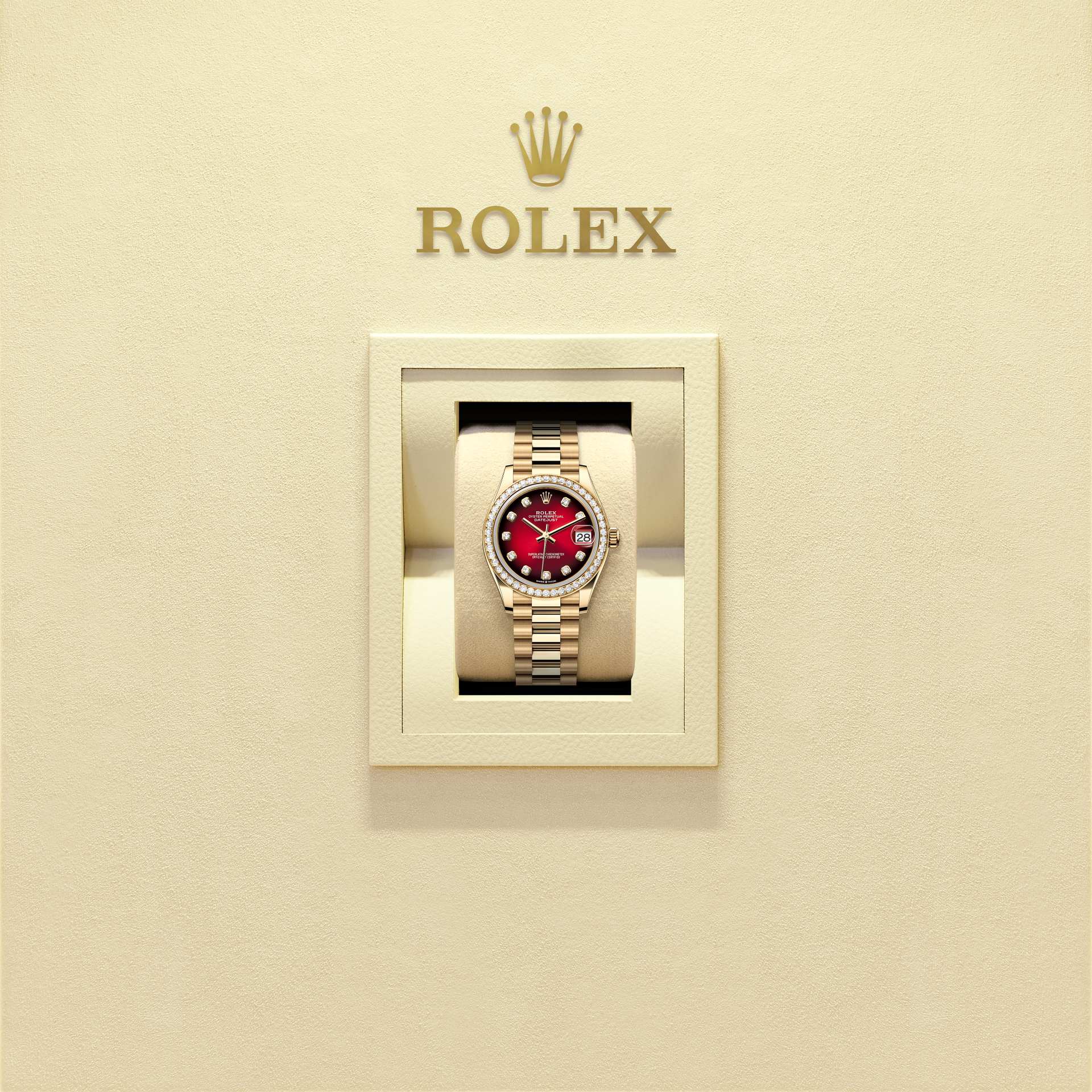 This Oyster Perpetual Datejust 31 in 18 ct yellow gold features a red ombré, diamond-set dial and a President bracelet.