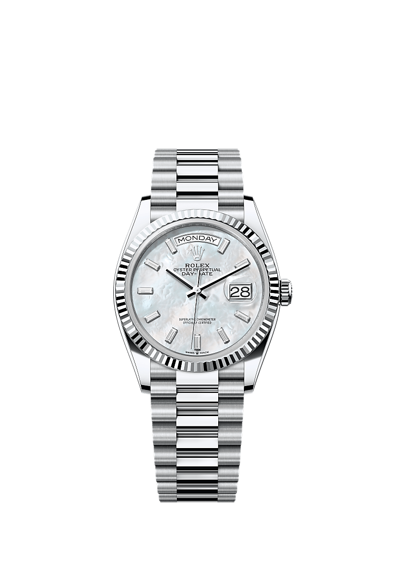 The Oyster Perpetual Day-Date 36 in platinum with a white mother-of-pearl, diamond-set dial, fluted bezel and a President bracelet.