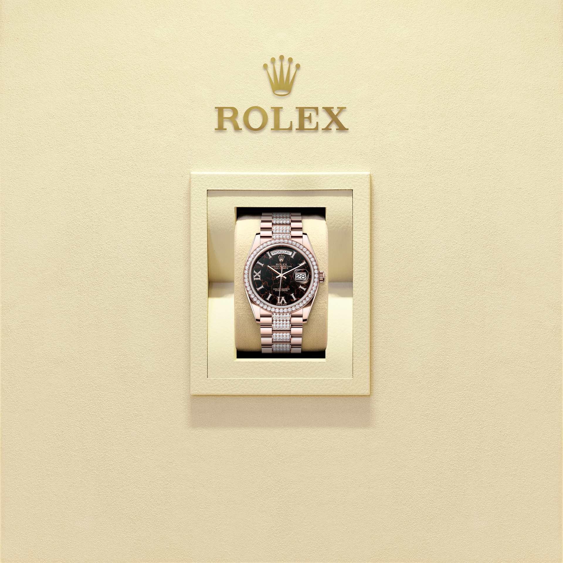 This dial features hour markers in 18 ct gold, set with 32 diamonds, and a Roman VI and IX in 18 ct gold, set with 24 diamonds. The Oyster Perpetual Day-Date 36 is presented with a dial made from eisenkiesel, a deep brown decorative stone used by the brand for the first time in 2021.