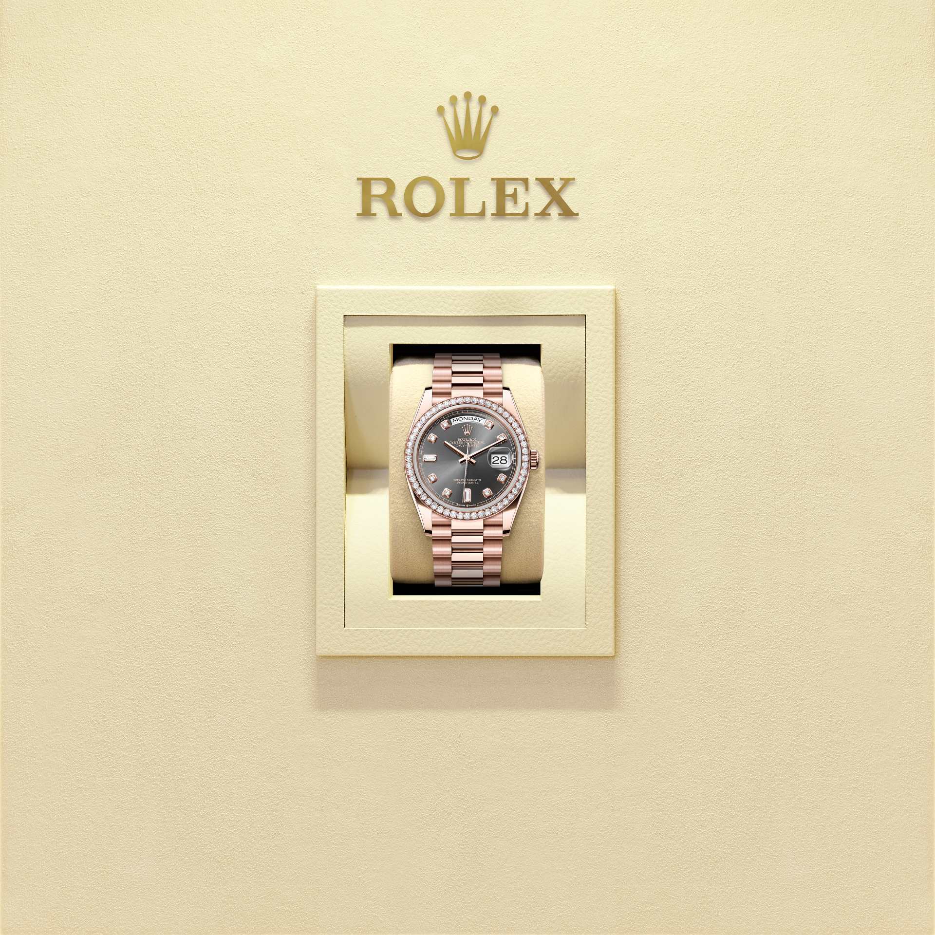 The Oyster Perpetual Day-Date 36 in 18 ct Everose gold, with a slate, diamond-set dial, diamond-set bezel and a President bracelet.