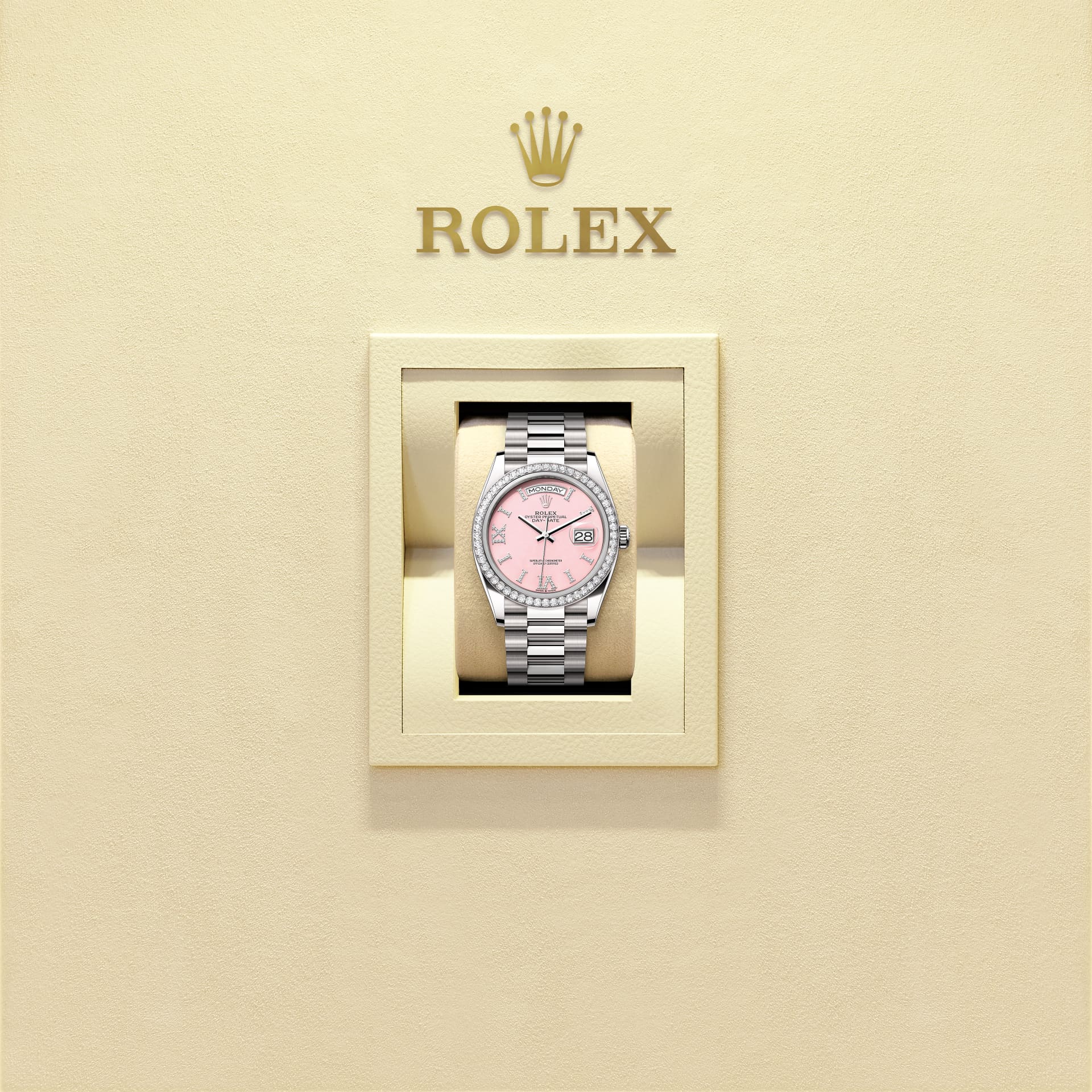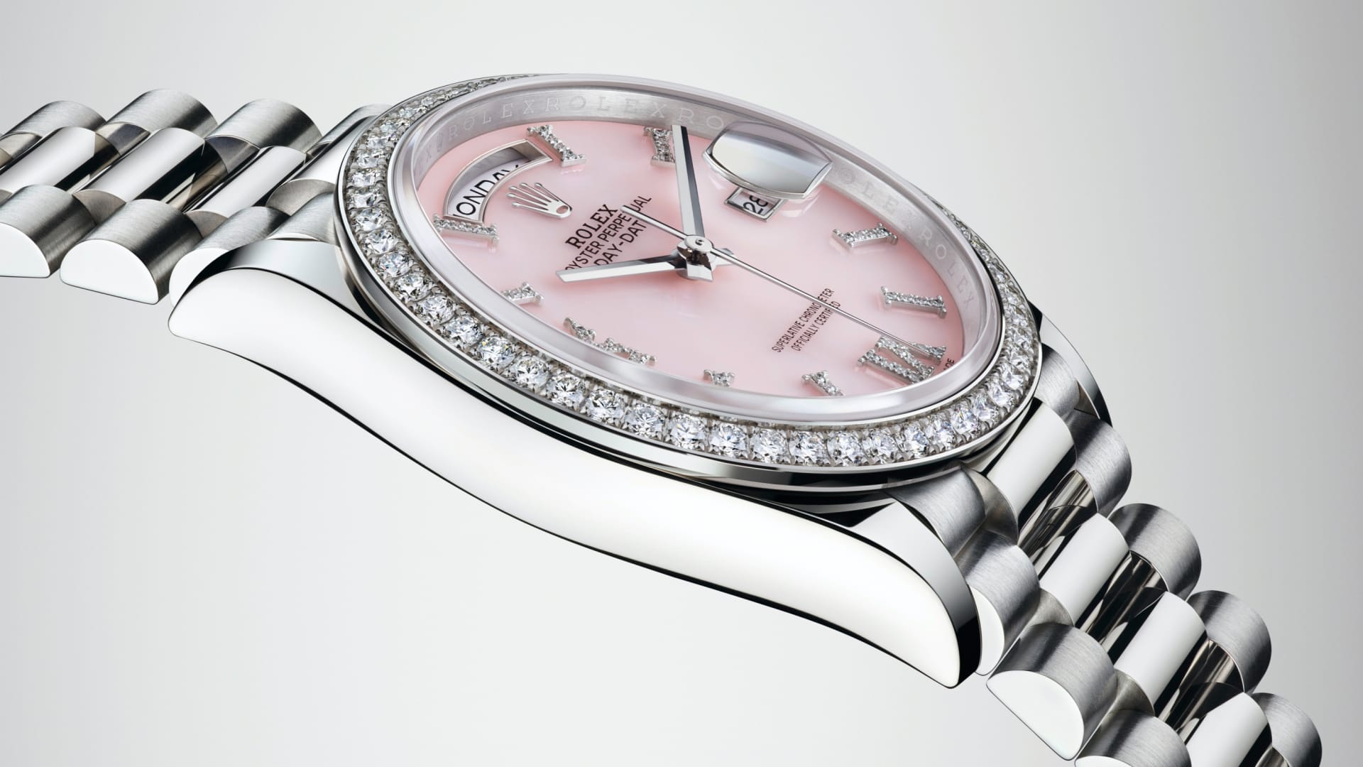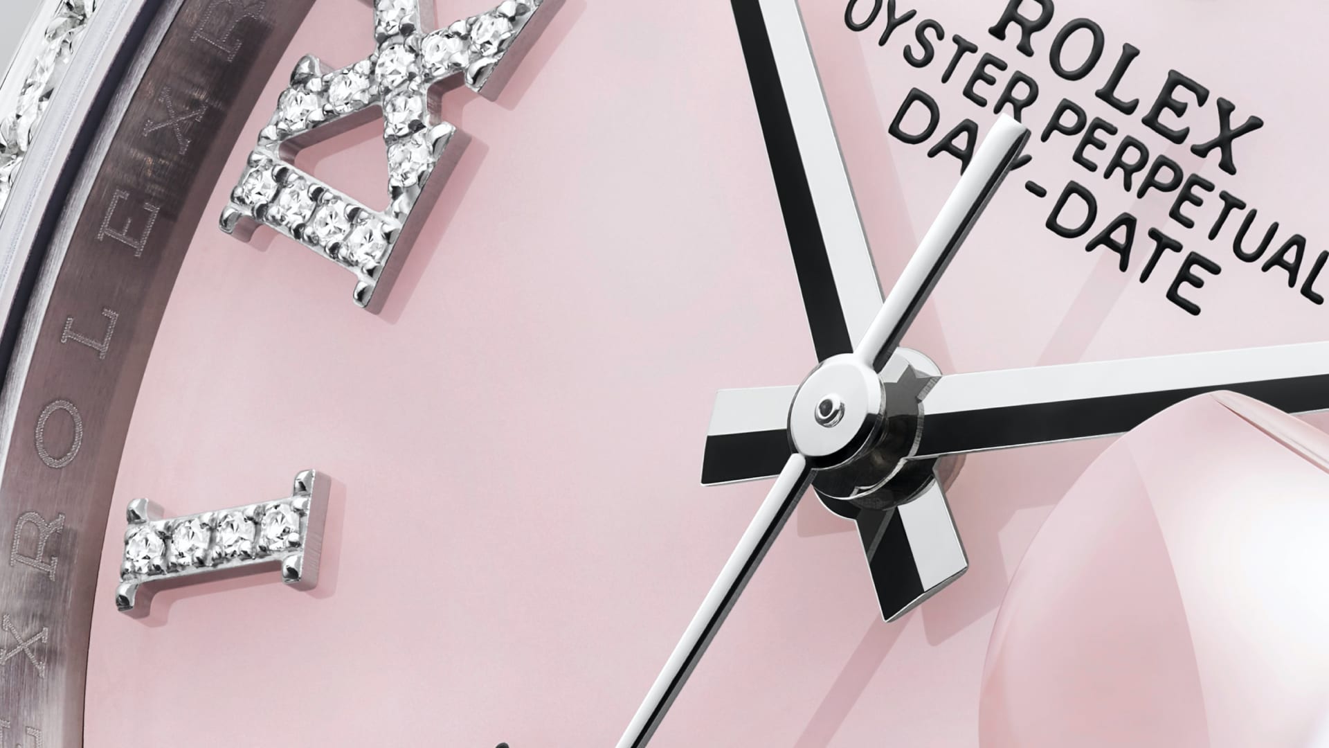 This dial features hour markers in 18 ct gold, set with 32 diamonds, and a Roman VI and IX in 18 ct gold, set with 24 diamonds. Rolex has developed special expertise in the creation of dials made from decorative stone, such as pink opal.