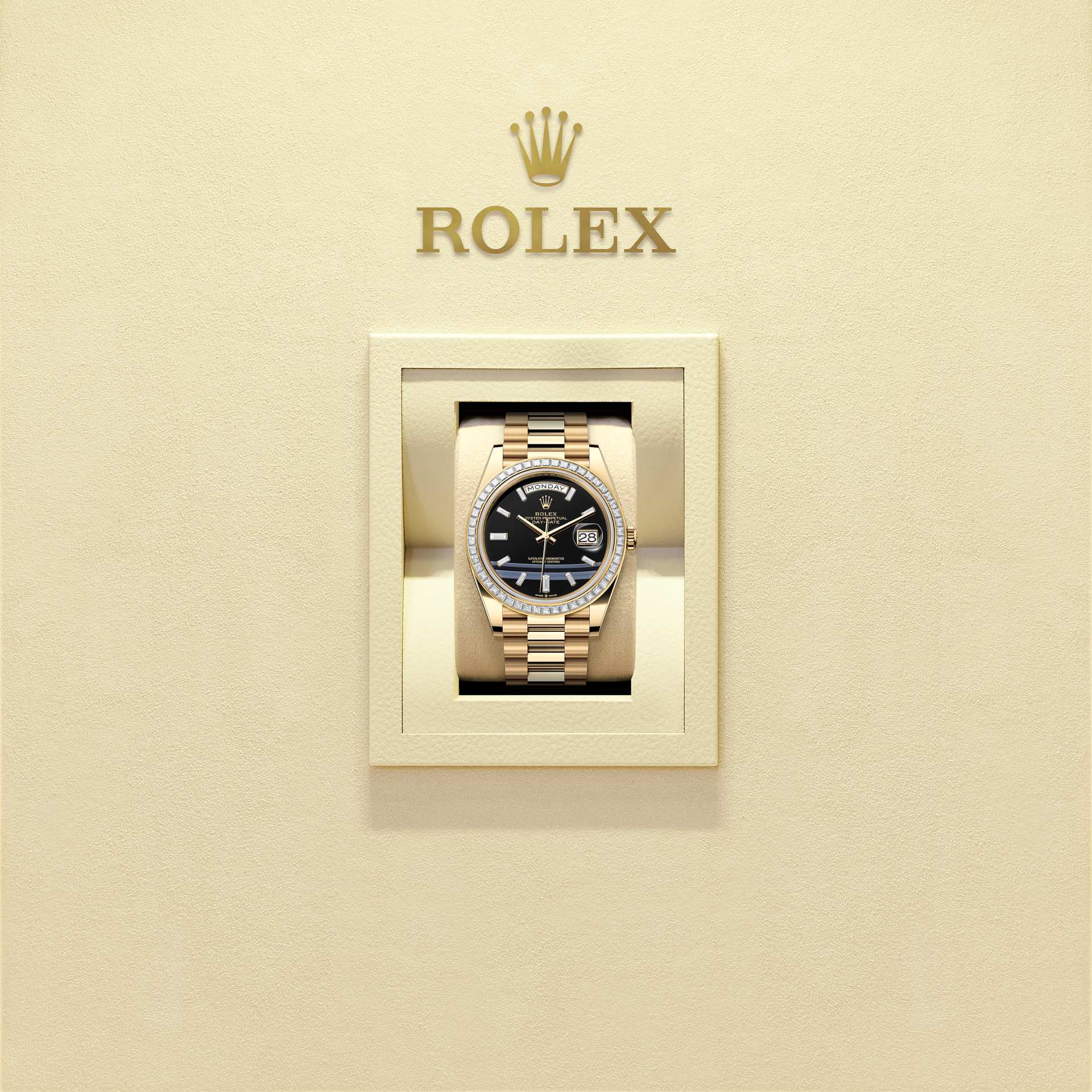 The Oyster Perpetual Day-Date 40 in 18 ct yellow gold, with an onyx, diamond-set dial, diamond-set bezel and a President bracelet.