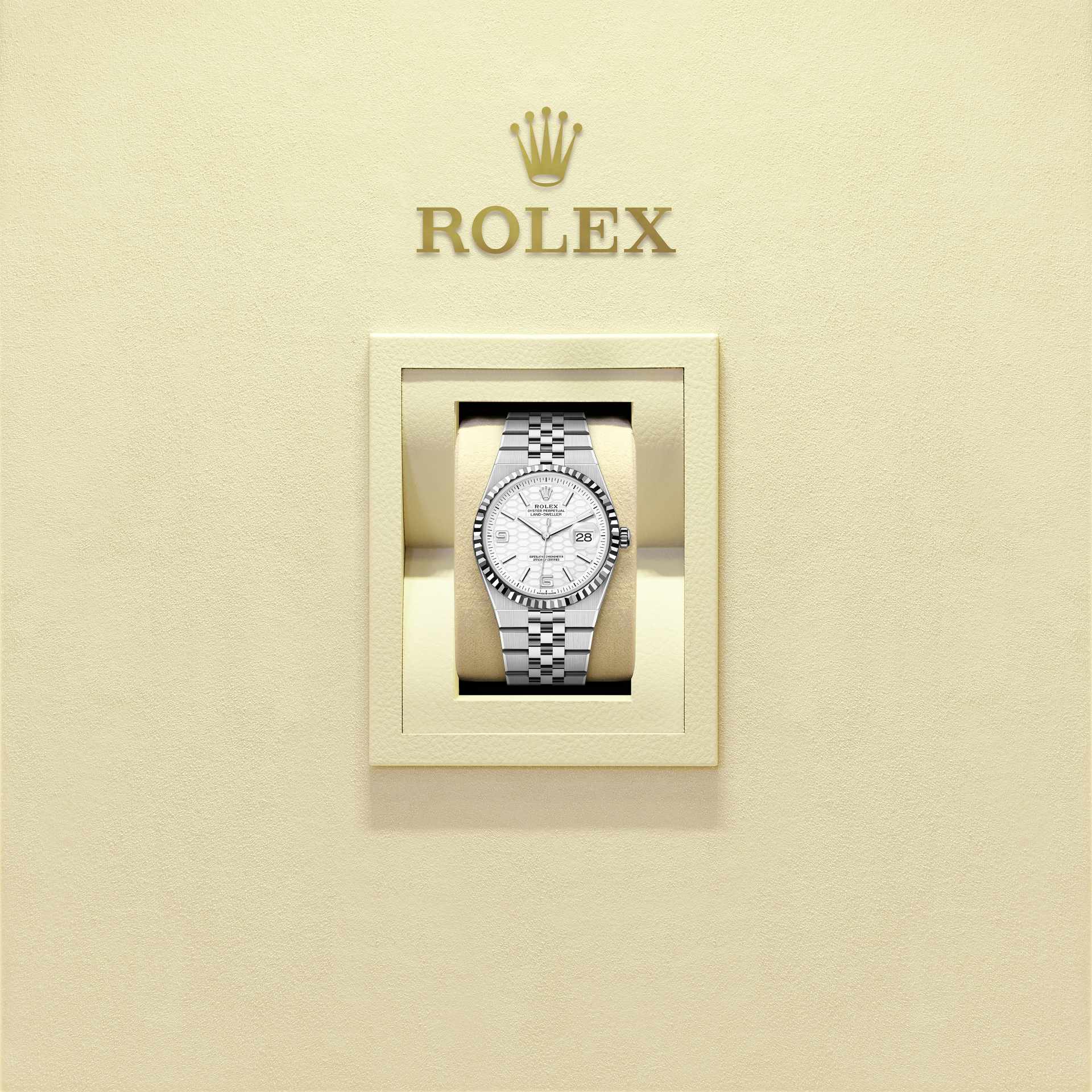 The Land-Dweller 36 in Oystersteel and white gold with an intense white, honeycomb-motif dial and Flat Jubilee bracelet.