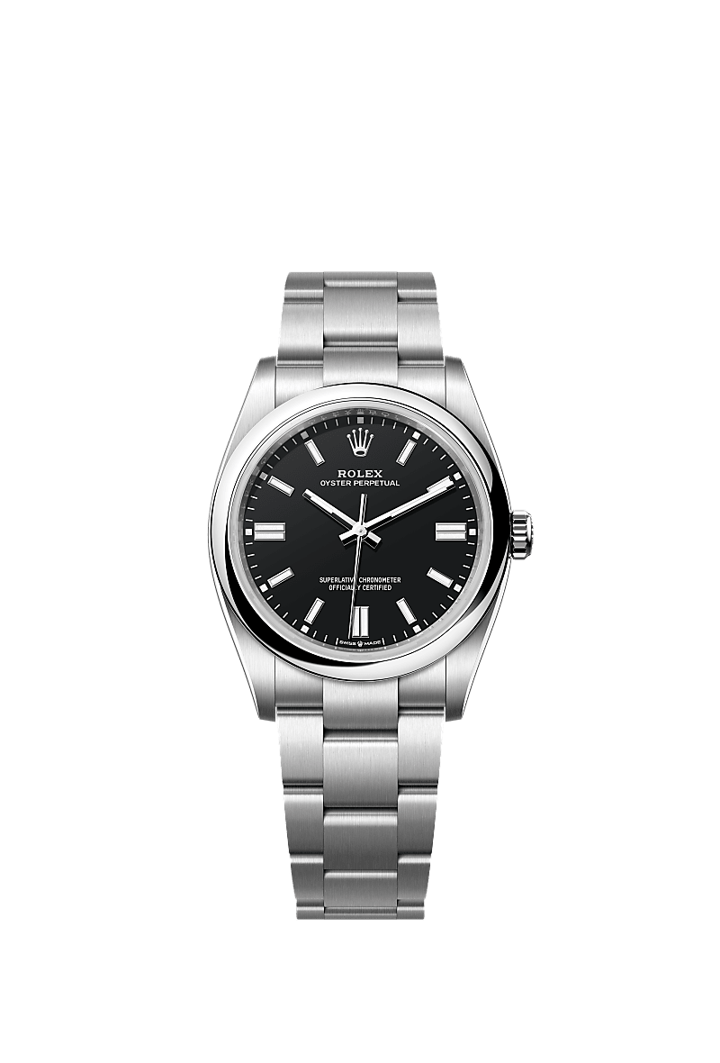 The Oyster Perpetual 36 with a black dial and an Oyster bracelet.