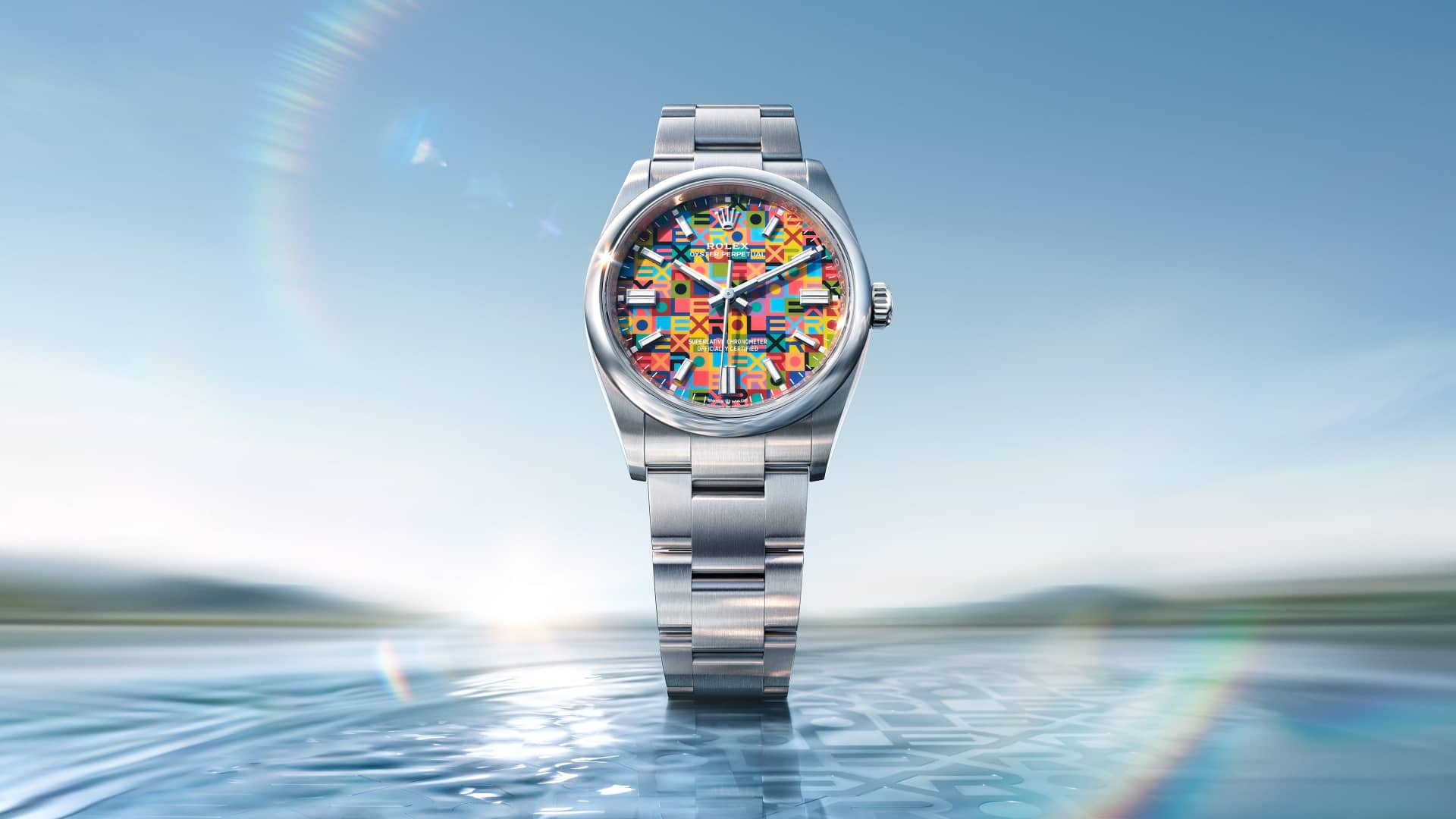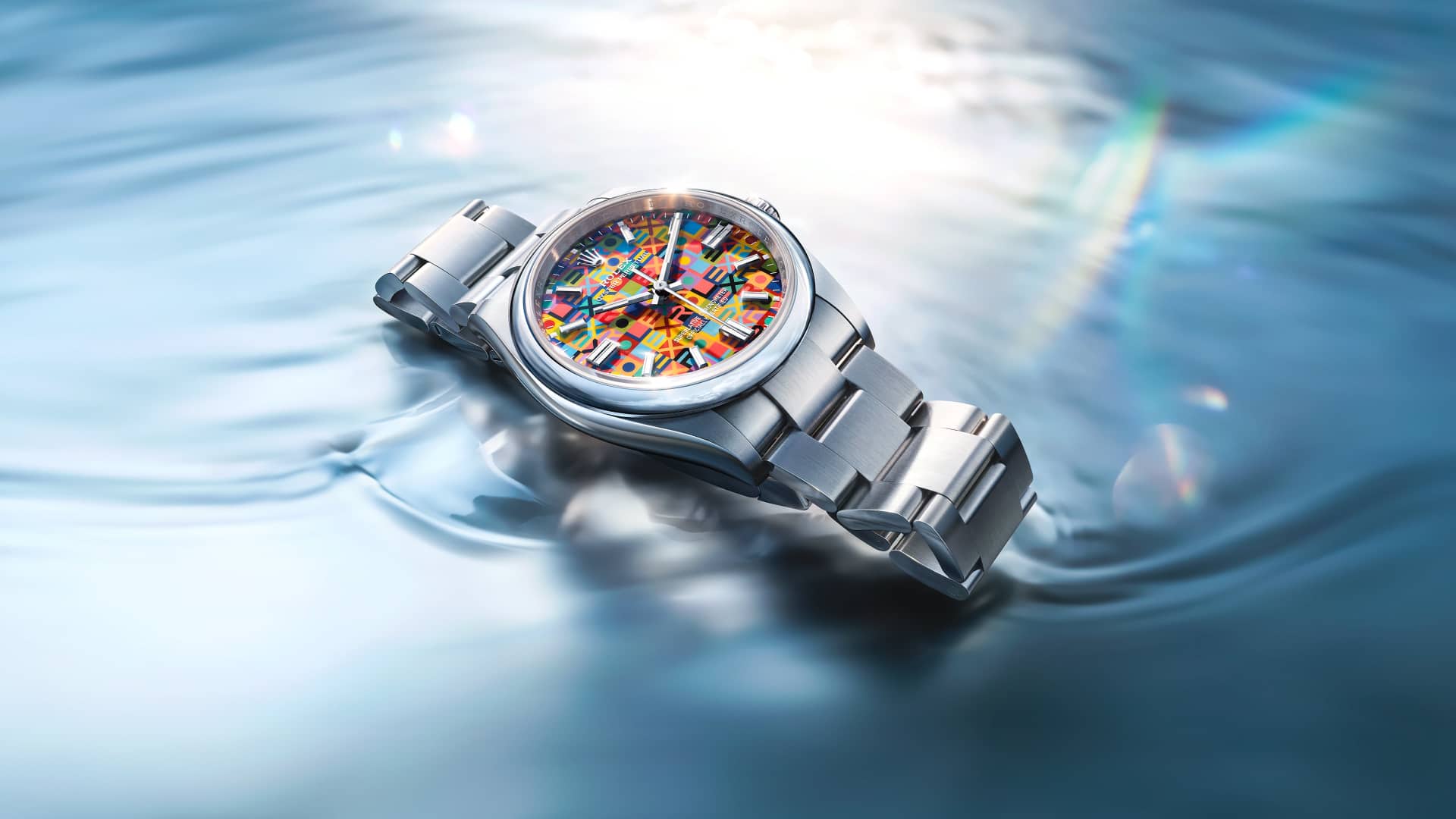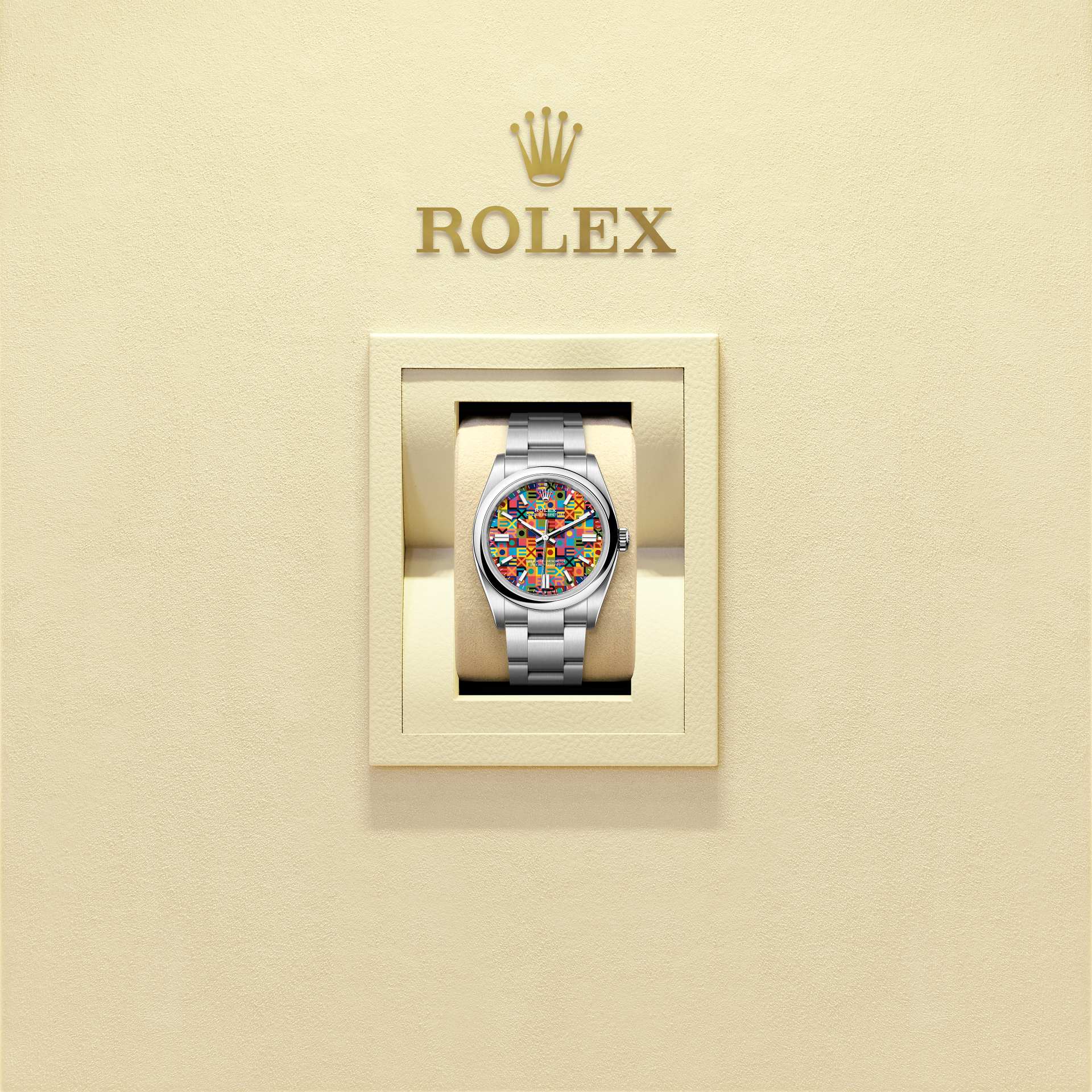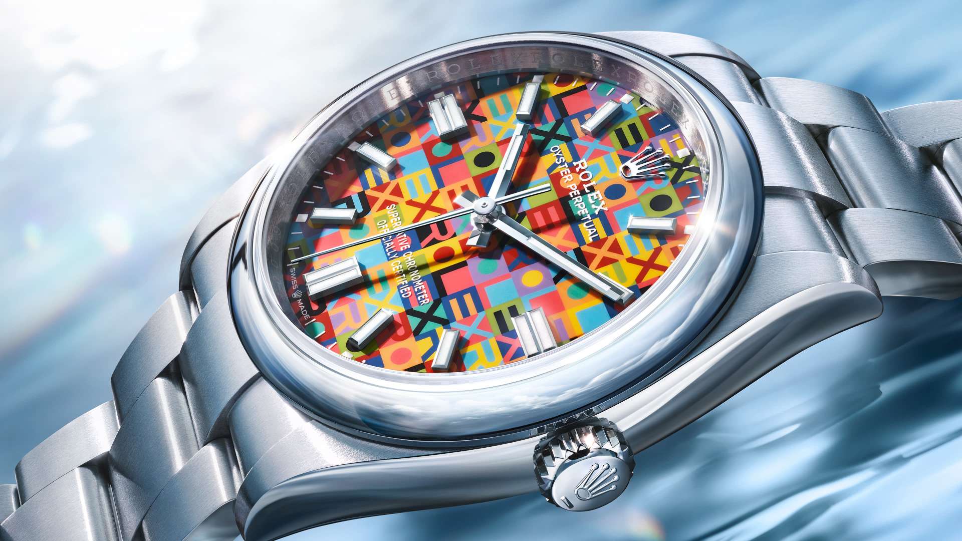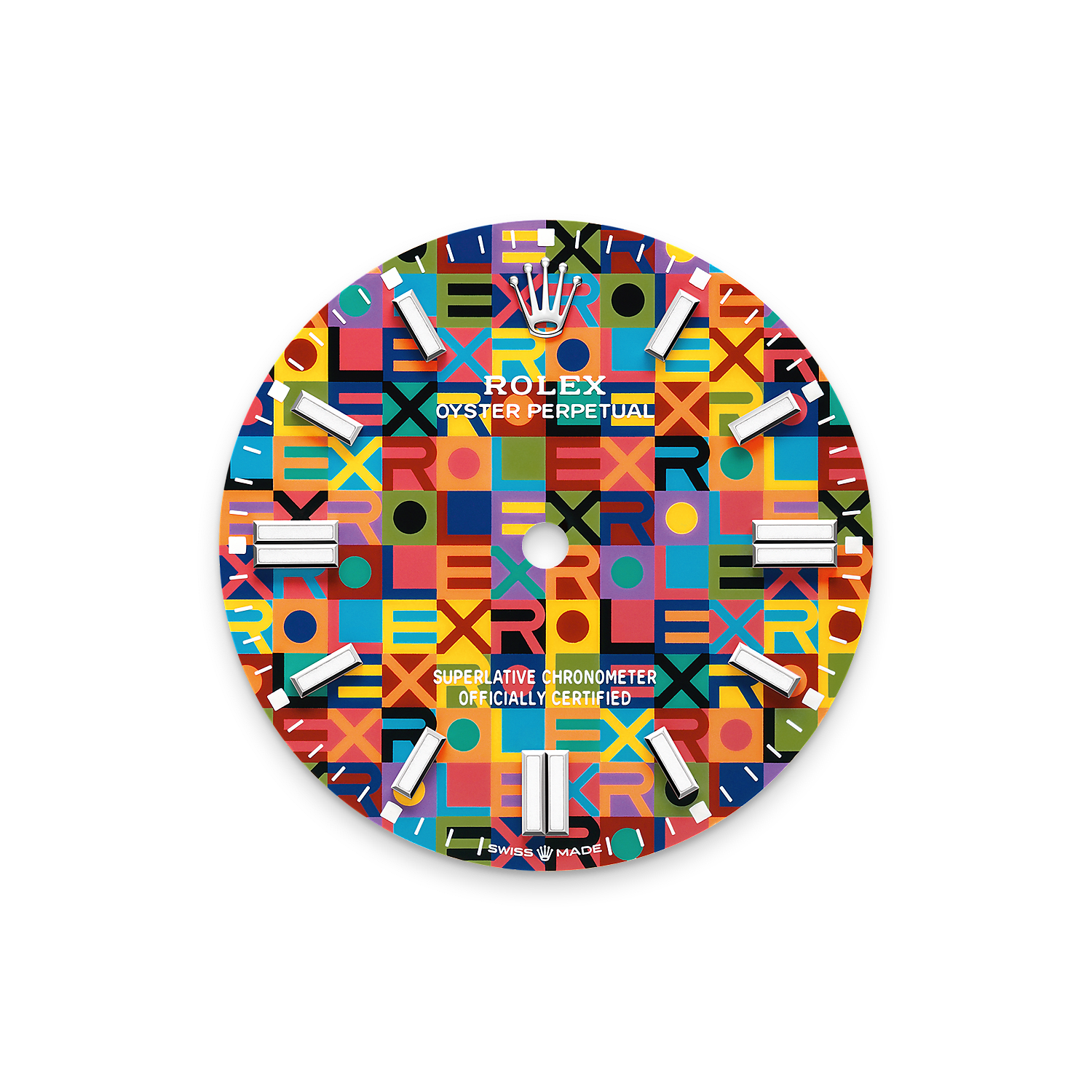It displays the letters of the Rolex name in a contrasting interplay of no fewer than ten colours. Executing this pattern presents a significant challenge, as the colours are applied not all at once, but one after the other. The utmost precision is also required to ensure that all the shapes and letters making up the motif are positioned perfectly.