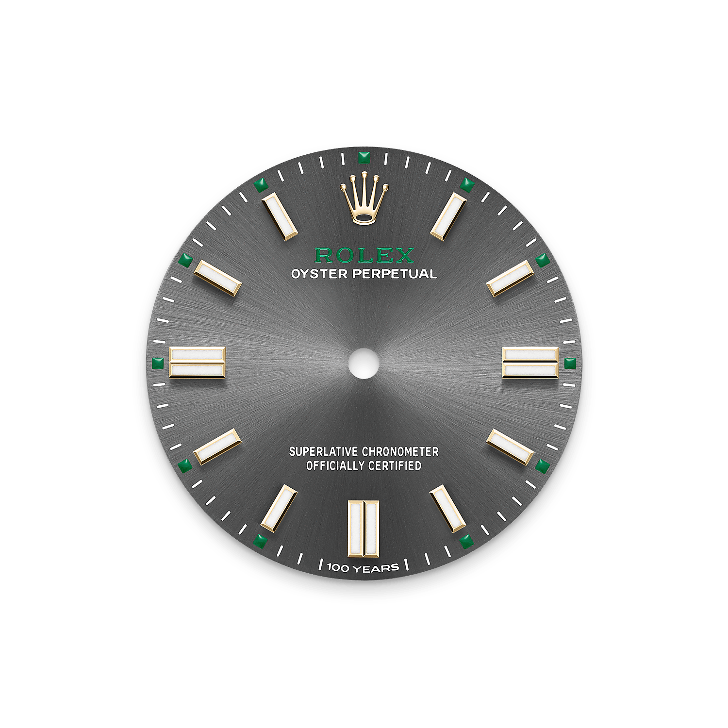 On the slate dial – a new colour for the Oyster Perpetual range – the inscription ‘100 years’ appears at 6 o’clock in place of the usual ‘Swiss Made’ marking.
