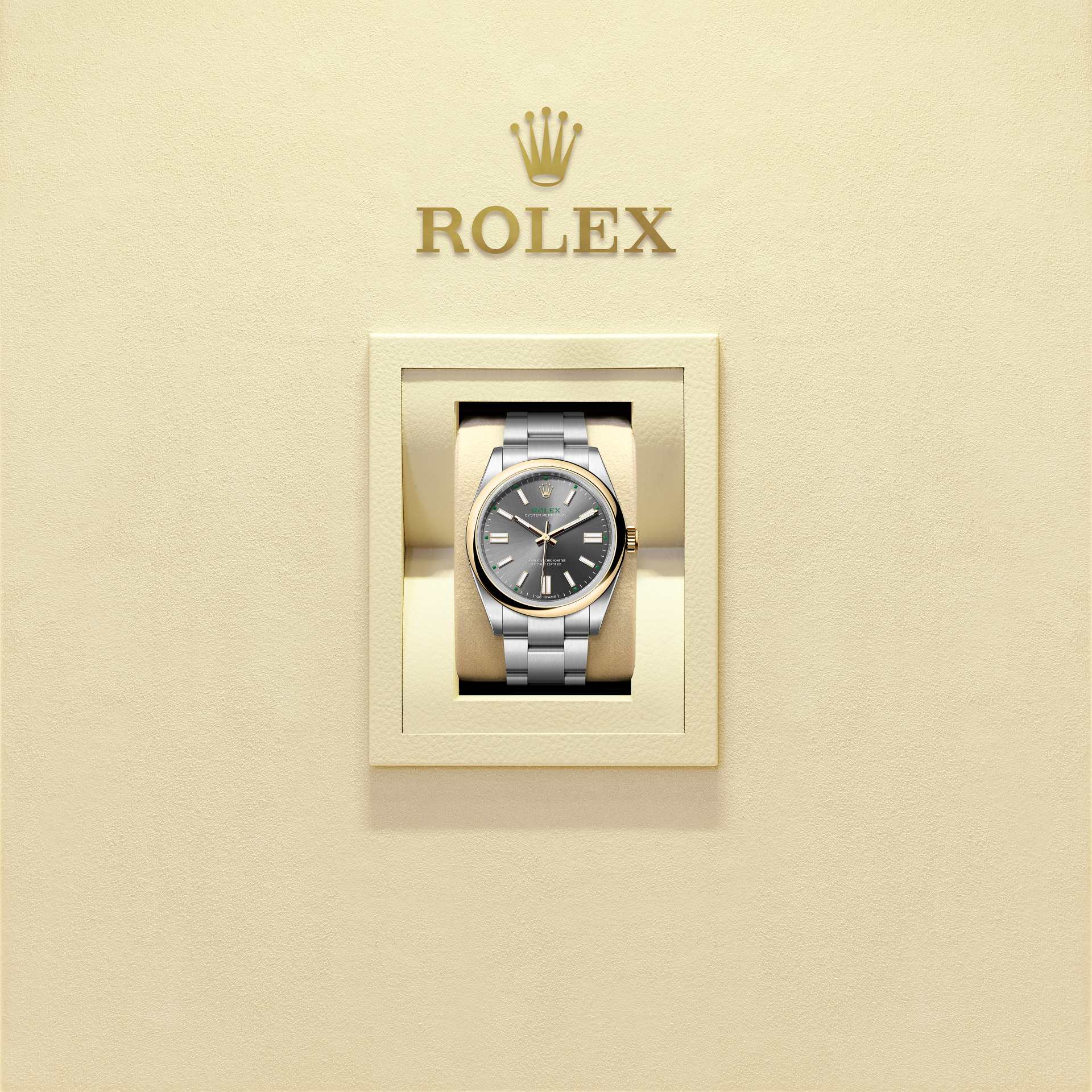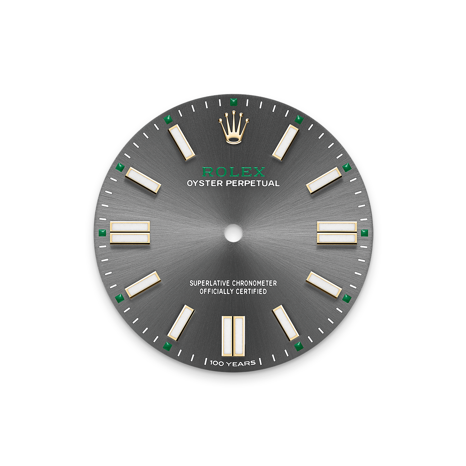 On the slate dial – a new colour for the Oyster Perpetual range – the inscription ‘100 years’ appears at 6 o’clock in place of the usual ‘Swiss Made’ marking.
