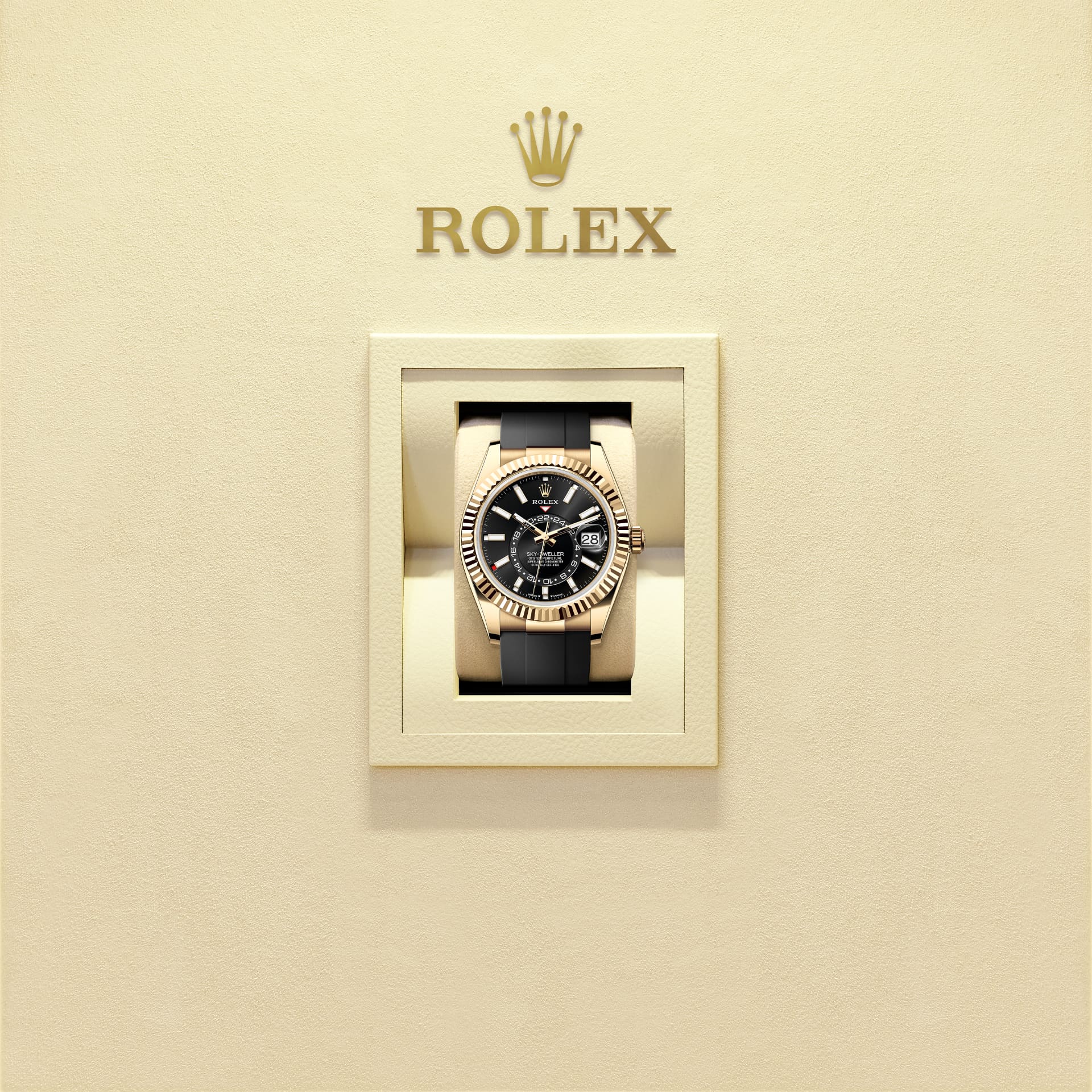 It was therefore identical to the fluting on the case back, which was also screwed onto the case for waterproofness, using specific Rolex tools. Over time, the fluting became an aesthetic element, a genuine Rolex signature feature. Today the fluted bezel is a mark of distinction, always in gold. The Sky-Dweller is equipped with a mechanism of interaction between the rotatable bezel, the winding crown and the movement: the Ring Command system, which allows the user to select the watch's functions one-by-one and to set them easily, quickly and securely.