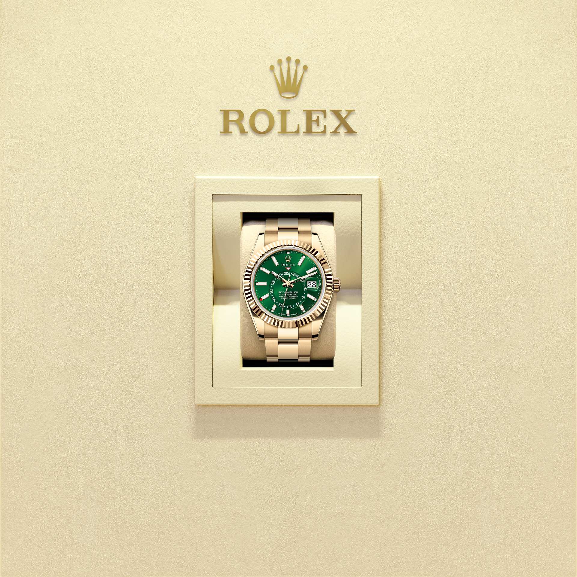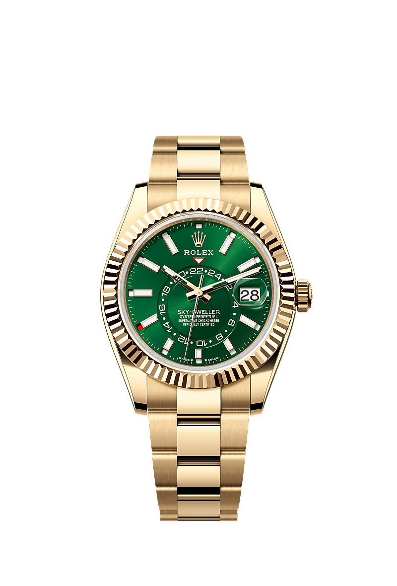 The Oyster Perpetual Sky-Dweller in 18 ct yellow gold with a bright green dial and an Oyster bracelet.
