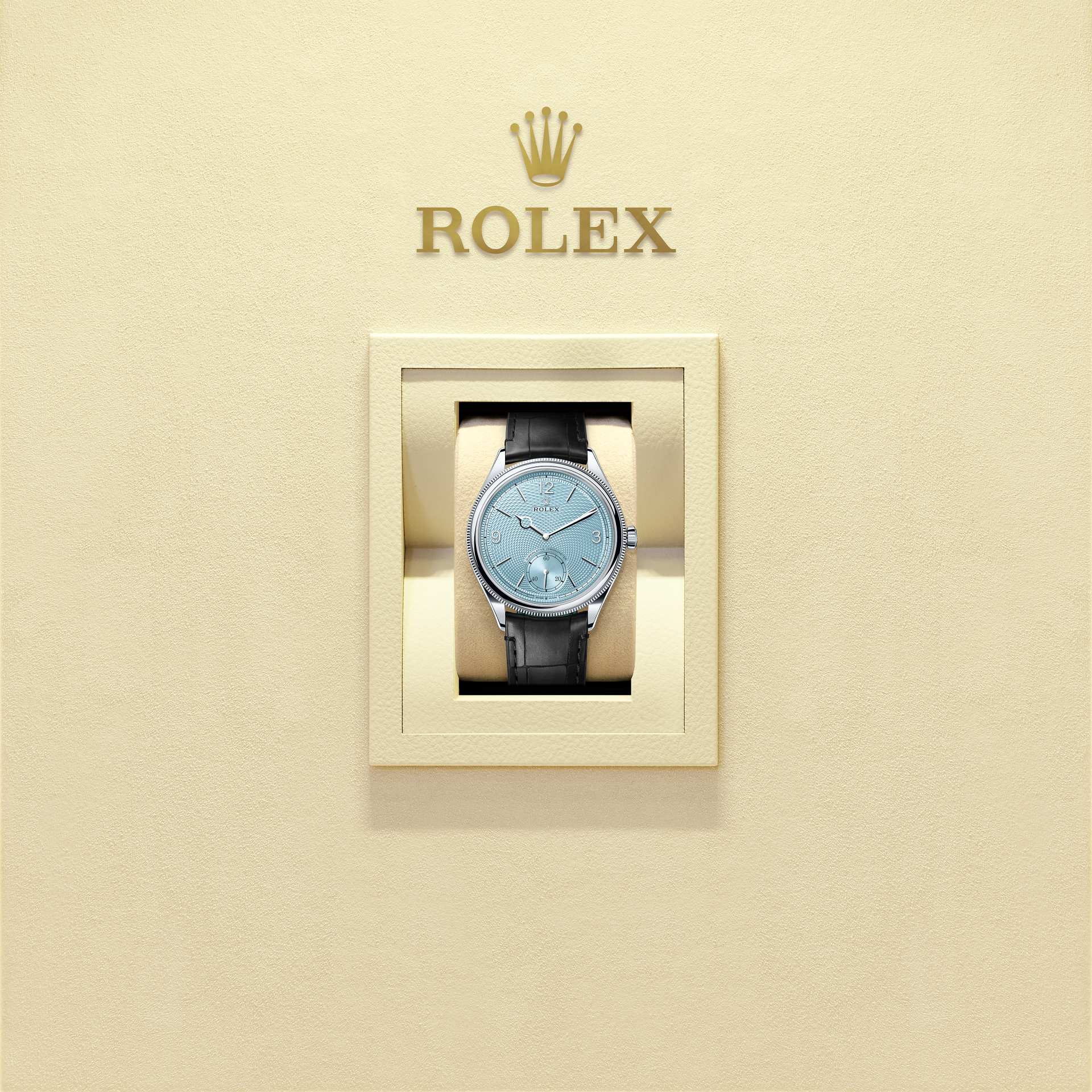 冰蓝色表盘饰以谷粒纹。自6点钟位置的小秒针盘开始,富有立体感的装饰圆窗几何图案重复出现,倍显与众不同。表盘的分钟刻度轨道周围饰有一圈精美的波形花纹边框。表盘图案由机刻雕花工艺打造,即利用车削刀具,在物体表面雕刻图案。此款表盘设计融蕴劳力士专业知识与创意巧思,同时亦致敬传统制表艺术,为恒动系列再添力作。一如18K金表款,恒动1908型950铂金款腕表的表盘搭配阿拉伯数字3、9及12,以及同样的刻面钟点标记和指针设计。
