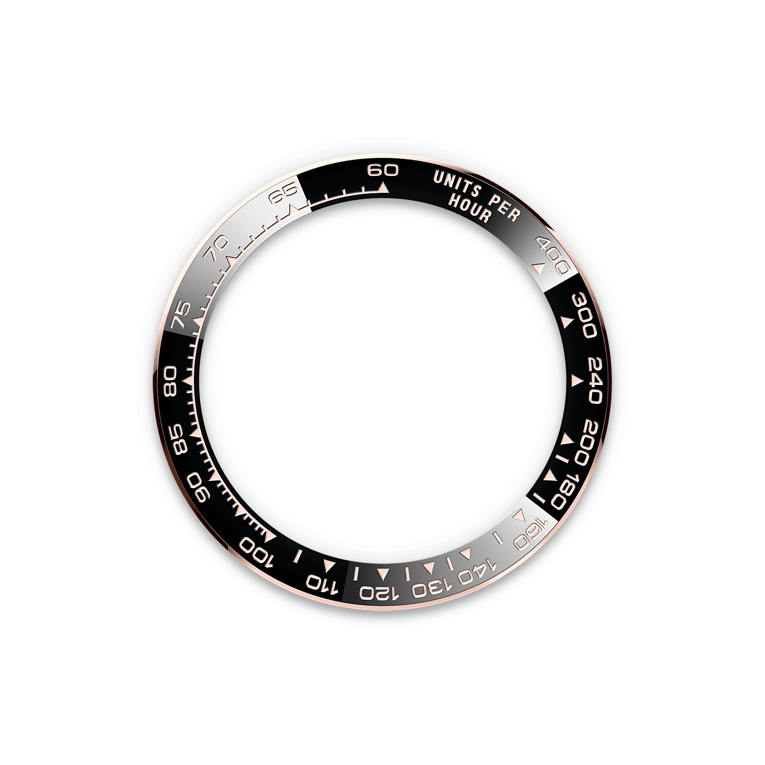 腕表的标志特色为铸模测速计外圈,最高测速可达平均时速400英里或公里。黑色外圈结合高科技与流丽设计,令人联想起1965年搭配黑色树脂玻璃字圈的表款。
