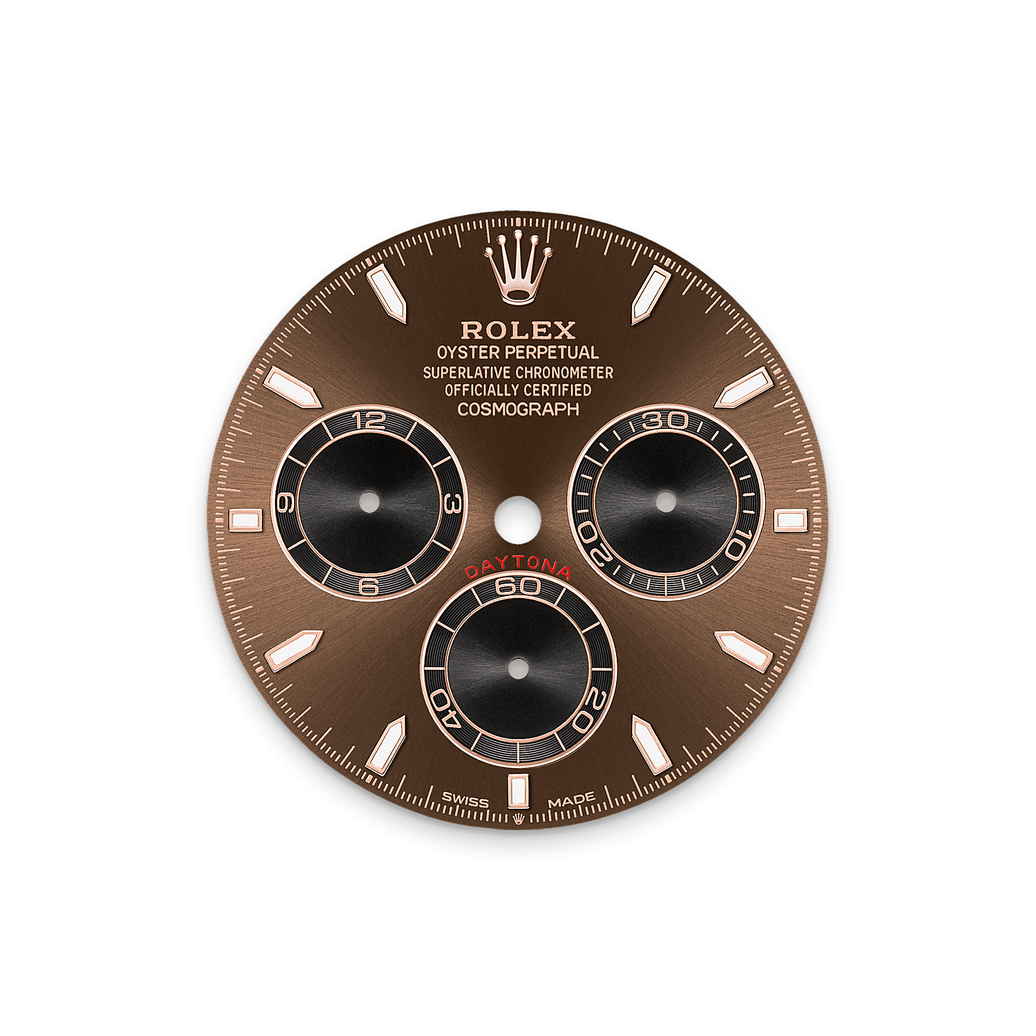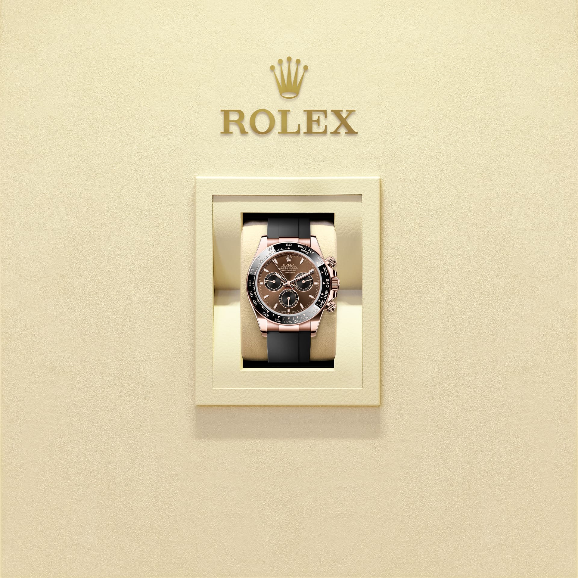 蚝式恒动宇宙计型迪通拿腕表18K永恒玫瑰金款,搭配巧克力色及黑色表盘及Oysterflex表带,黑色Cerachrom外圈设测速计。