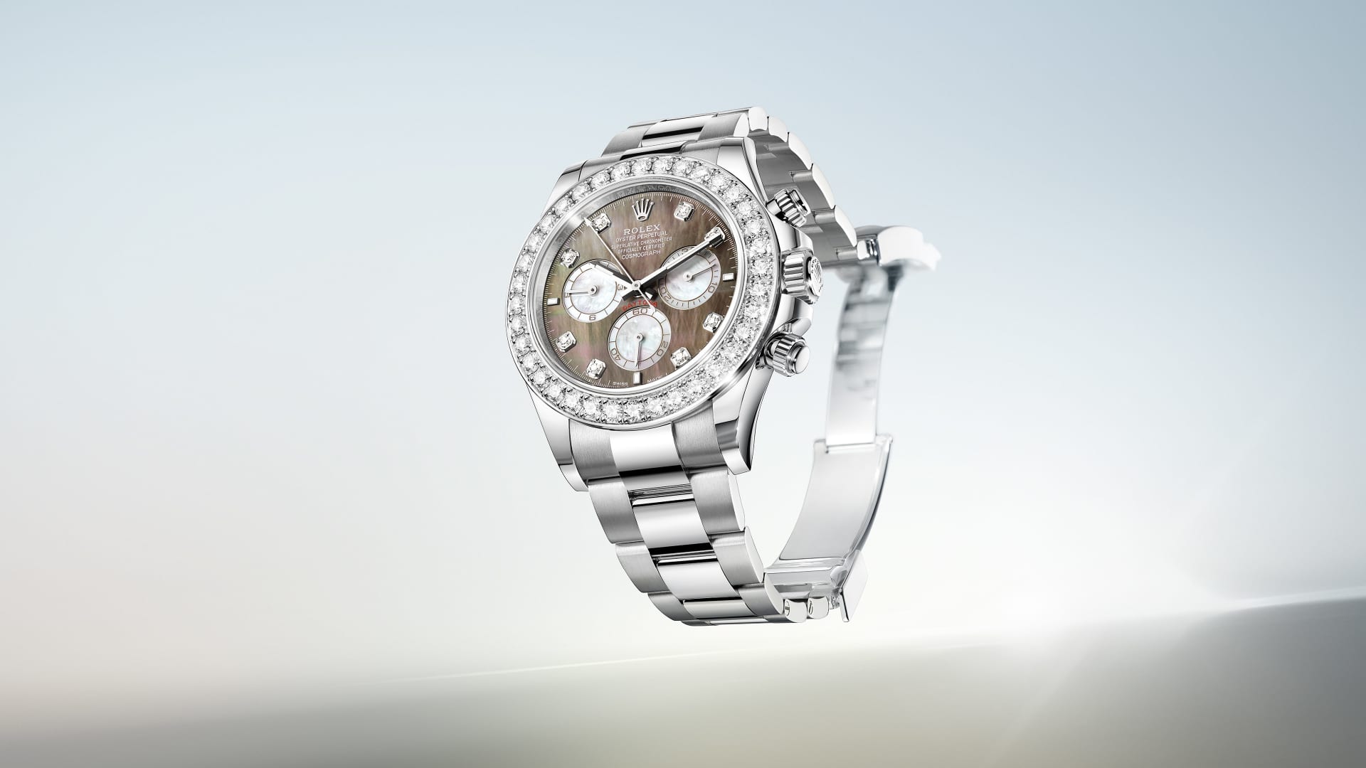 蚝式恒动宇宙计型迪通拿腕表18K白色黄金款,搭配镶钻黑色及白色珍珠母表盘、蚝式(Oyster)表带及镶钻外圈。