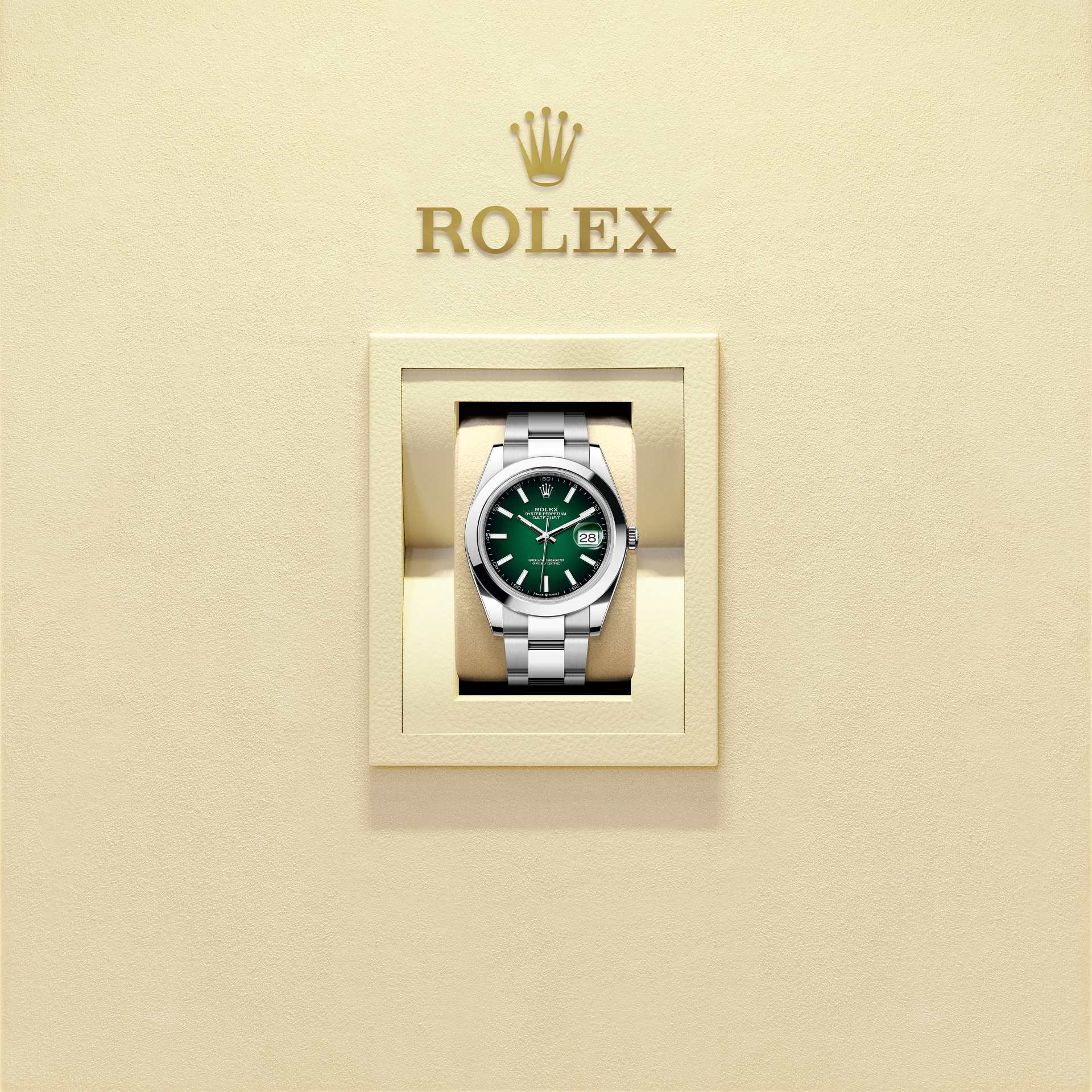蚝式恒动日志型 41腕表蚝式钢款,搭配渐变绿色表盘及蚝式(Oyster)表带。